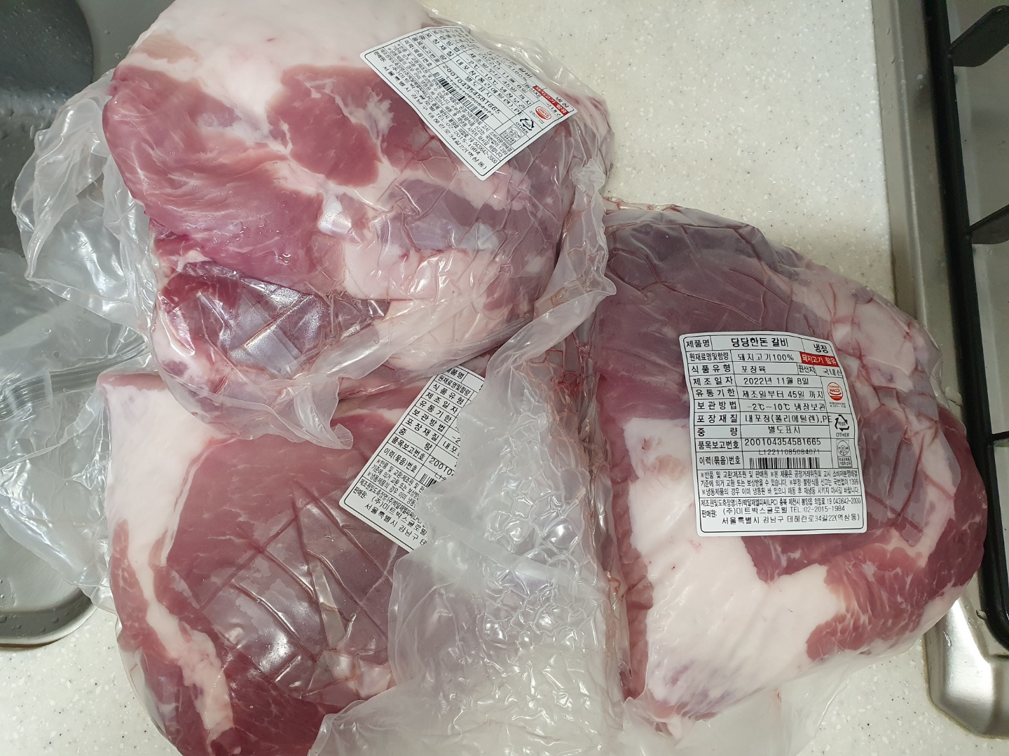 미트박스에서 돼지갈비를 주문했는데, 최소 단위가 3개라서 3개 (4.5kg) 주문했습니다.