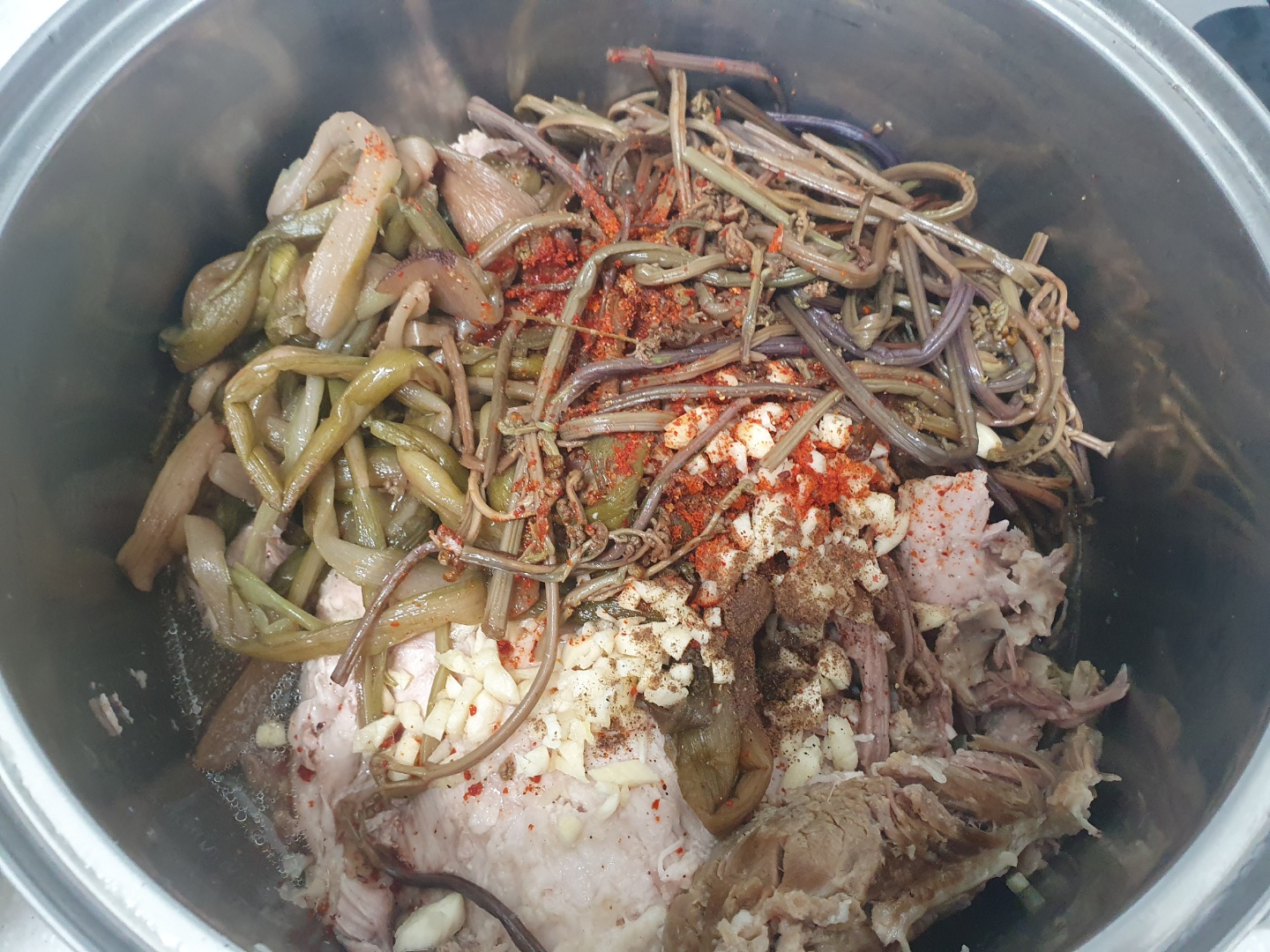 냄비에 삶은 고기, 삶은 고사리, 토란줄기, 마늘, 고춧가루, 간장, 들깨가루, 생강가루와 육수를 넣고 끓입니다.