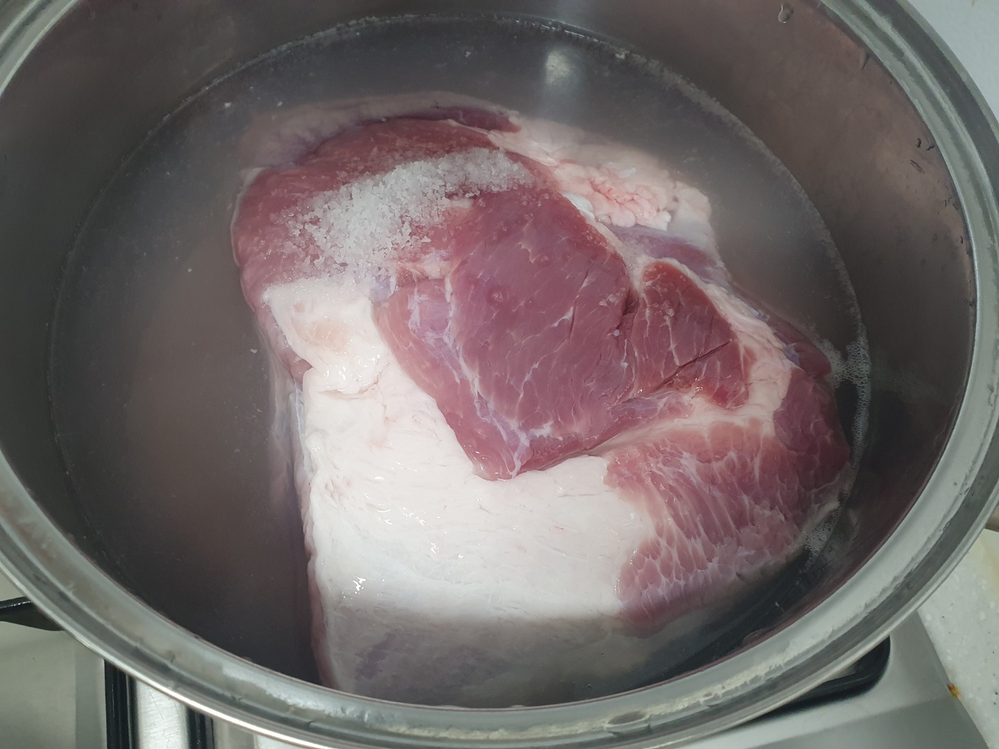 소금물에 30분쯤 담궈서 핏물을 빼고 물을 버린 후에 다시 소금물을 넣고 초벌로 20분 정도 삶았습니다.