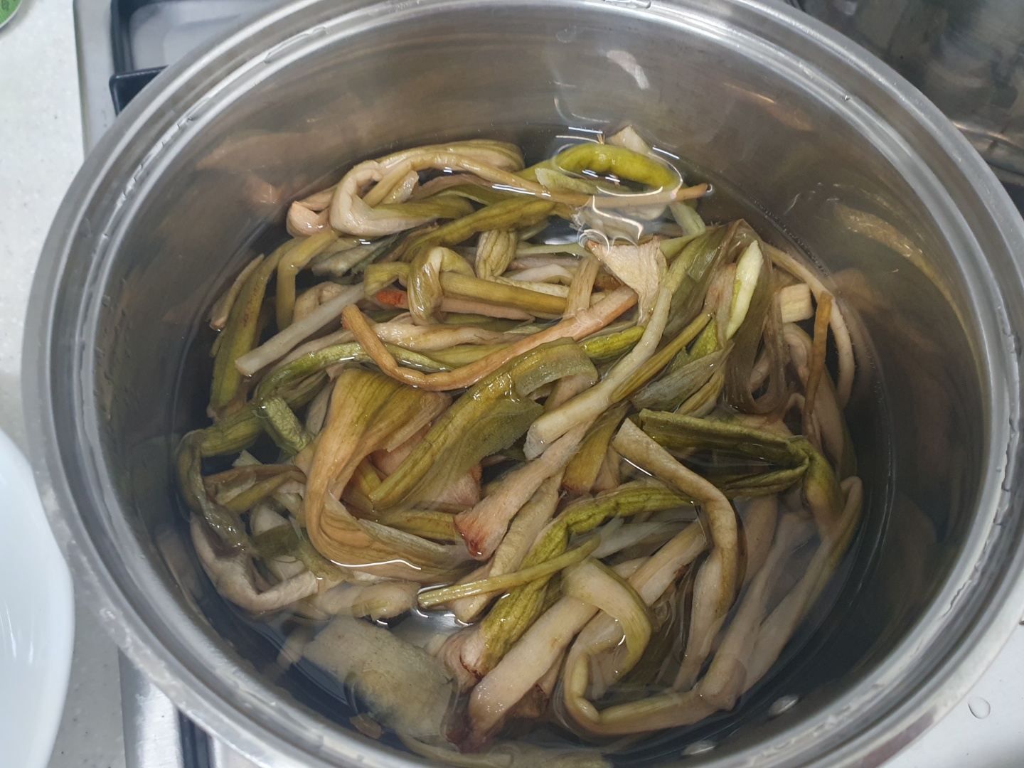 말린 토란과 말린 고사리를 밤새 불렸습니다. 원래는 갈비로 감자탕을 만들고 싶었는데, 우거지가 없고 제주도에서 사 온 고사리만 있어서 그냥 돈개장을 만들었습니다. 불린 후에 소금물에 삶고 물을 버리고 다시 물에 담가줍니다. 이과정을 2~3번 반복했습니다. 푹 무르고 아린 맛이 안 나올 때까지 합니다. 제대로 안 하면 못 먹을 물건이 될 수도 있습니다.