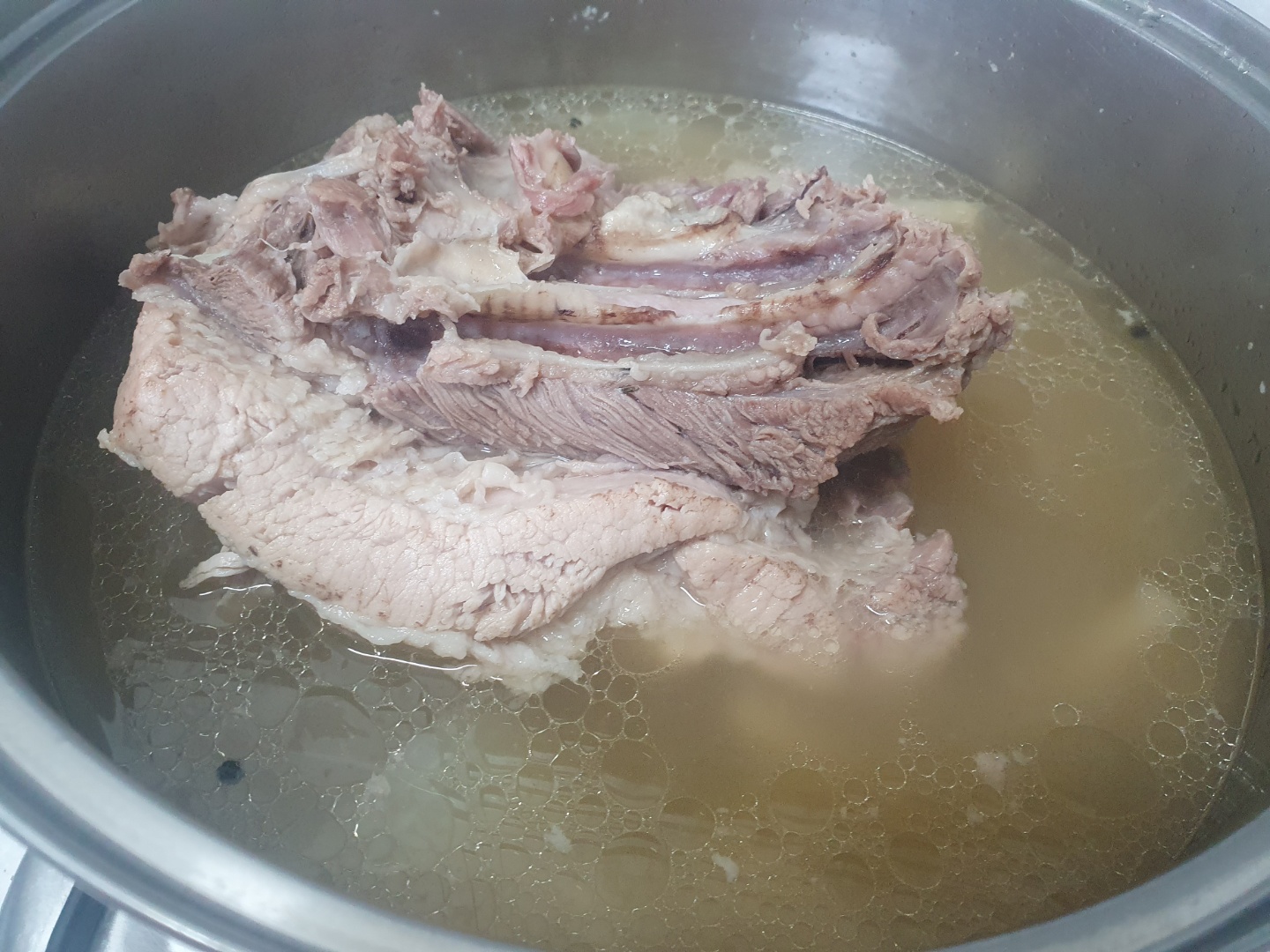 소금물에 30분쯤 담궈서 핏물을 빼고 물을 버린 후에 다시 소금물을 넣고 초벌로 20분 정도 삶았습니다.
