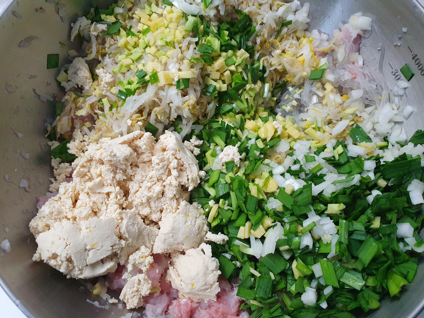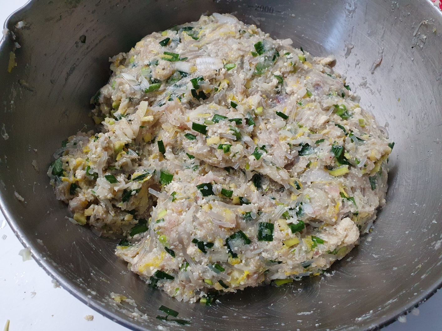 만두소- 돼지고기, 새우살, 오징어살, 당면, 두부, 숙주, 배추, 양파, 파, 애호박, 마늘, 생강, 소금, 후추