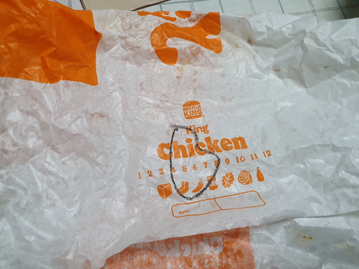 가져온 물건... 킹치킨이라 쓰여있고, BLT도 아니네요. BLT가 베이컨 양상추 토마토였던가...