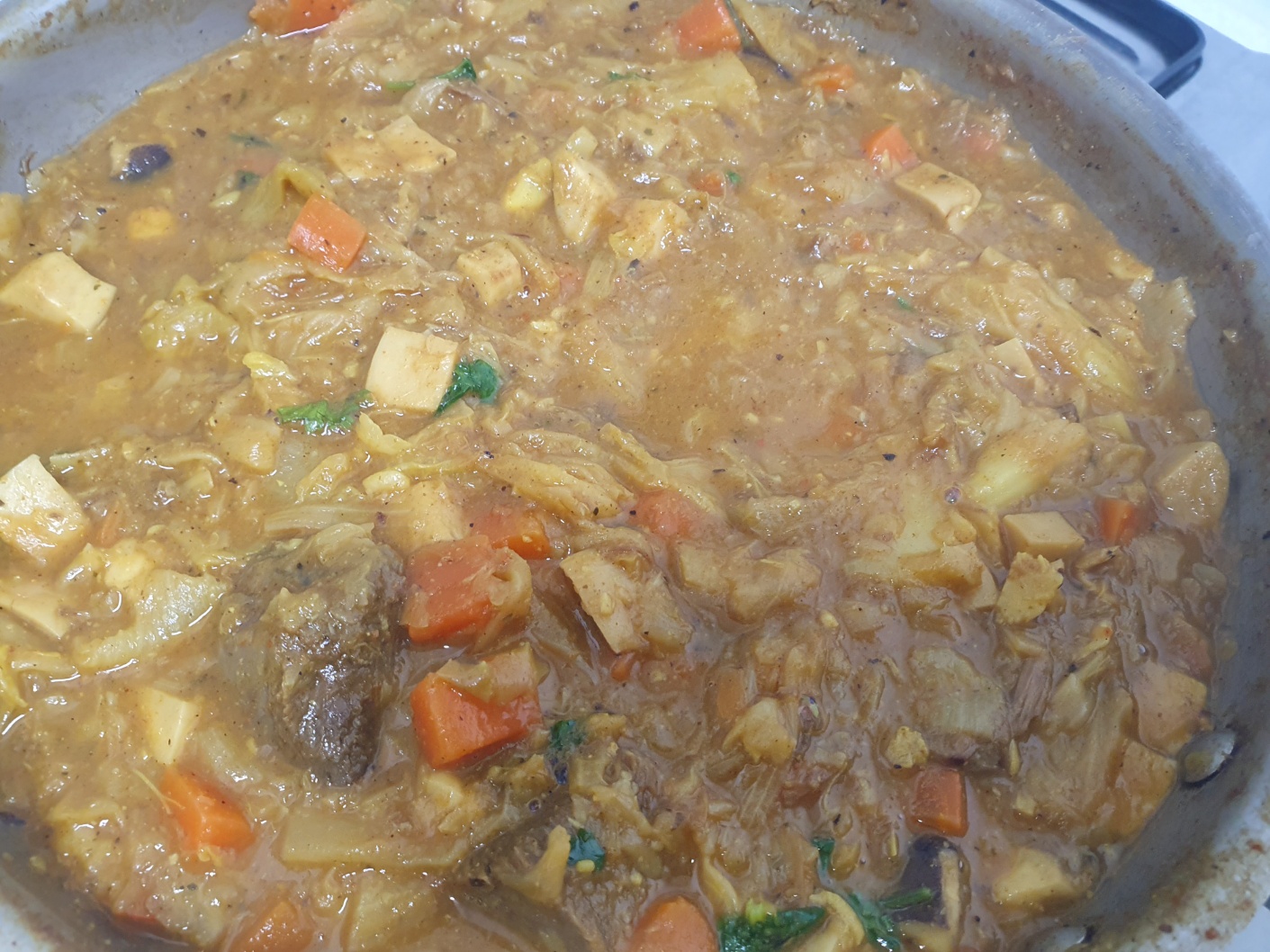 전분이(밀가루 볶은거) 아예 없으면 양배추가 흐물흐물한 게 모양이 영 아니라서 (사진 좌측처럼) 전분이 들어있는 카레가루와 물도 조금 넣었습니다. 냉장고에서 방치되던 고수도 넣었습니다.