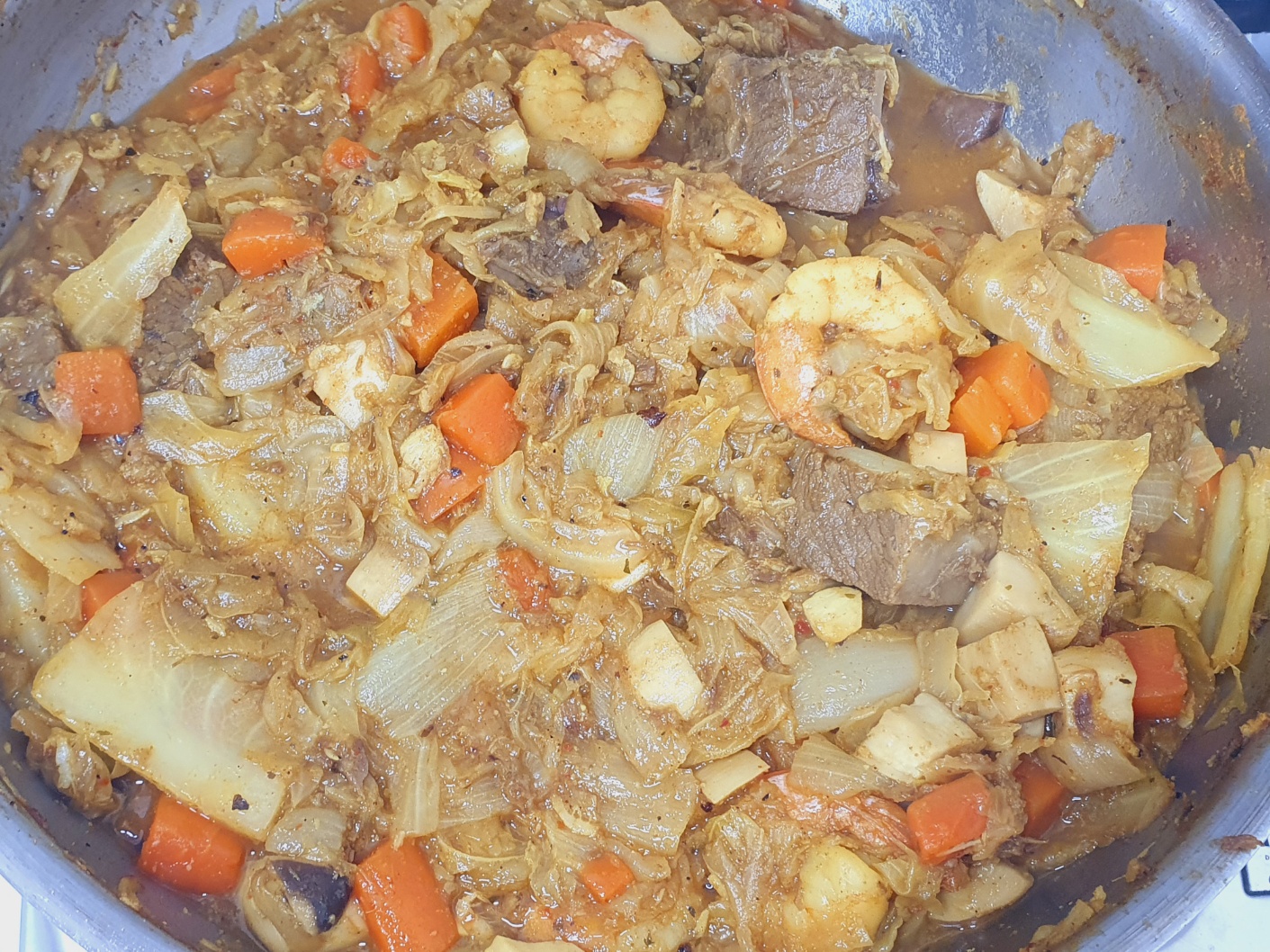 전분이(밀가루 볶은거) 아예 없으면 양배추가 흐물흐물한 게 모양이 영 아니라서 (사진 좌측처럼) 전분이 들어있는 카레가루와 물도 조금 넣었습니다. 냉장고에서 방치되던 고수도 넣었습니다.