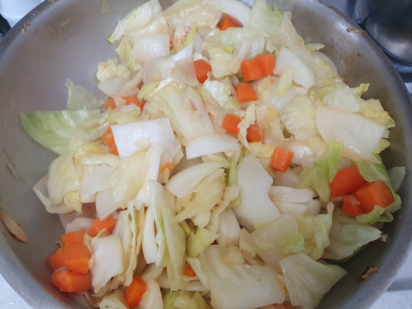 팬에 기름을 두르고 양파와 마늘을 볶다가 양배추도 넣고 볶습니다.