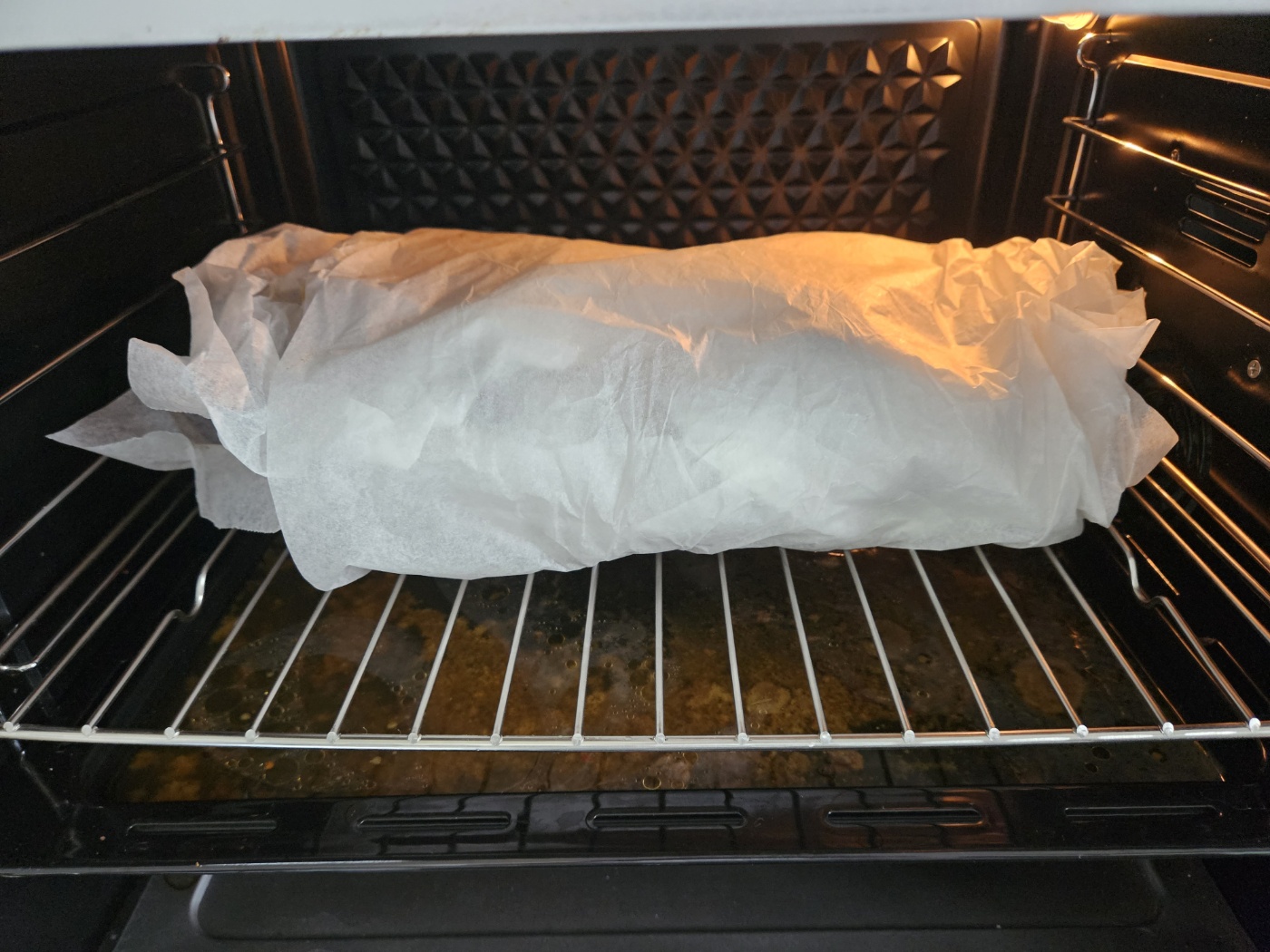 4시간 후에 종이 포일로 싸서 다시 오븐에 넣고 130도로 굽습니다.