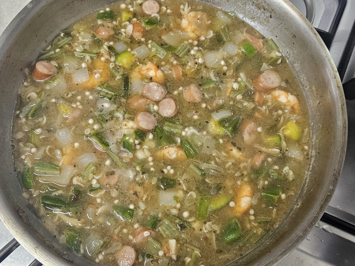 오크라, 새우, 소세지, 양파, 애호박, 마늘, 케이준 시즈닝 or 검보 믹스