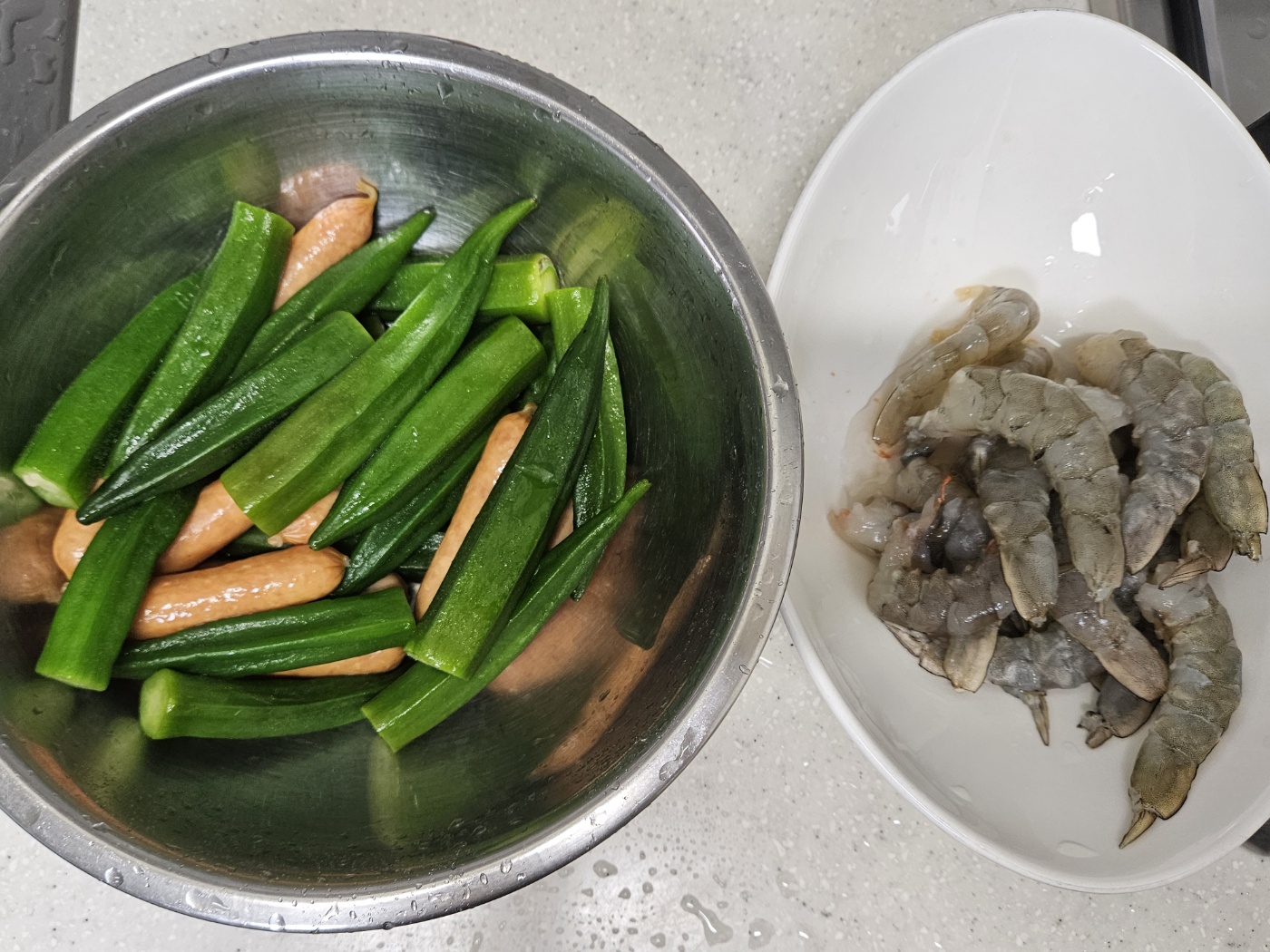 오크라, 새우, 소세지 모두 냉동이라 해동을 했습니다.