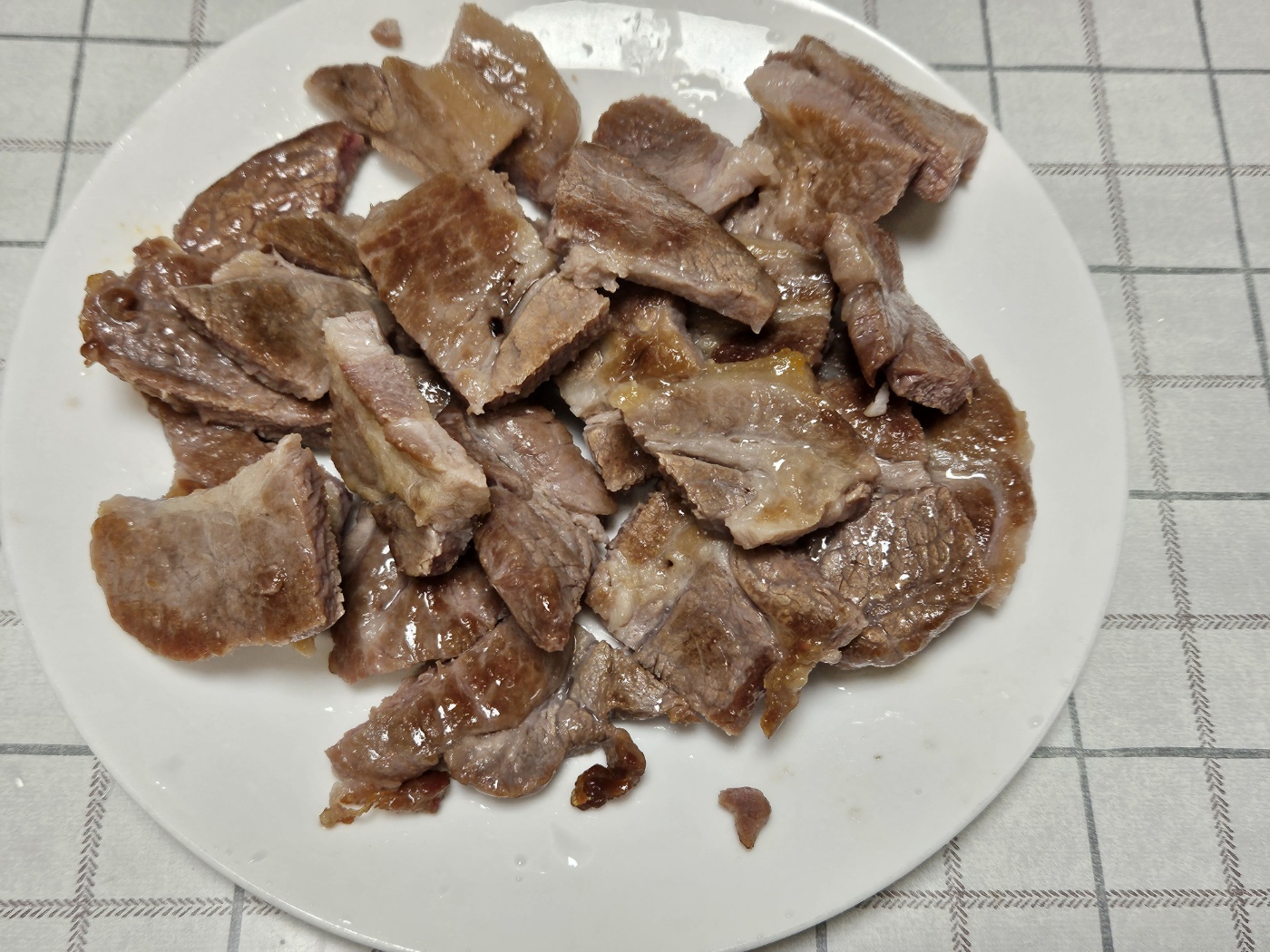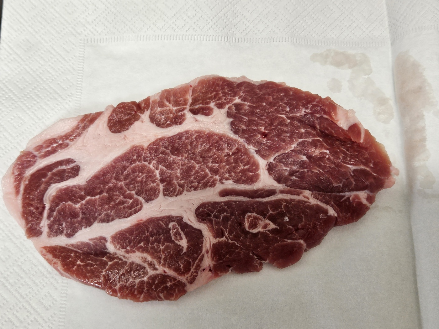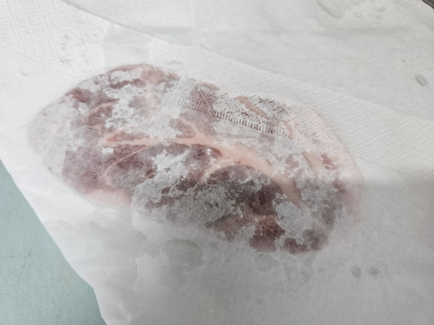 아래는 해동지로 수분을 제거한 후 건조기에서 3시간 정도 건조한 후 며칠간 냉장고에서 숙성한 고기입니다.