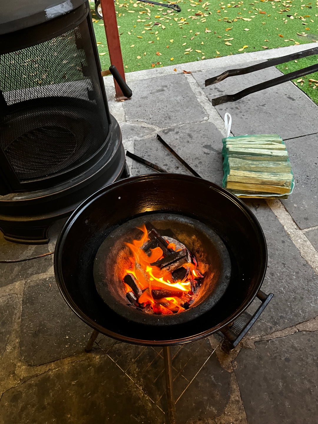 숯에 불을 붙이는 것도 쉽지 않지만, 잘 달궈져서 불이 안정되지 않으면 재료를 넣으면 안됩니다.