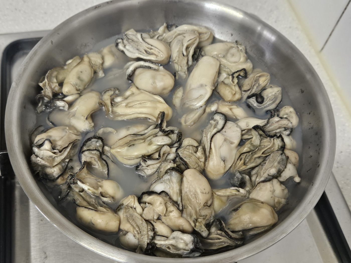 남은 굴은 굴소스 만들려고 물을 조금 넣고 데쳤습니다. 굴은 먹고 국물은 졸여서 굴소스를 만들었습니다.