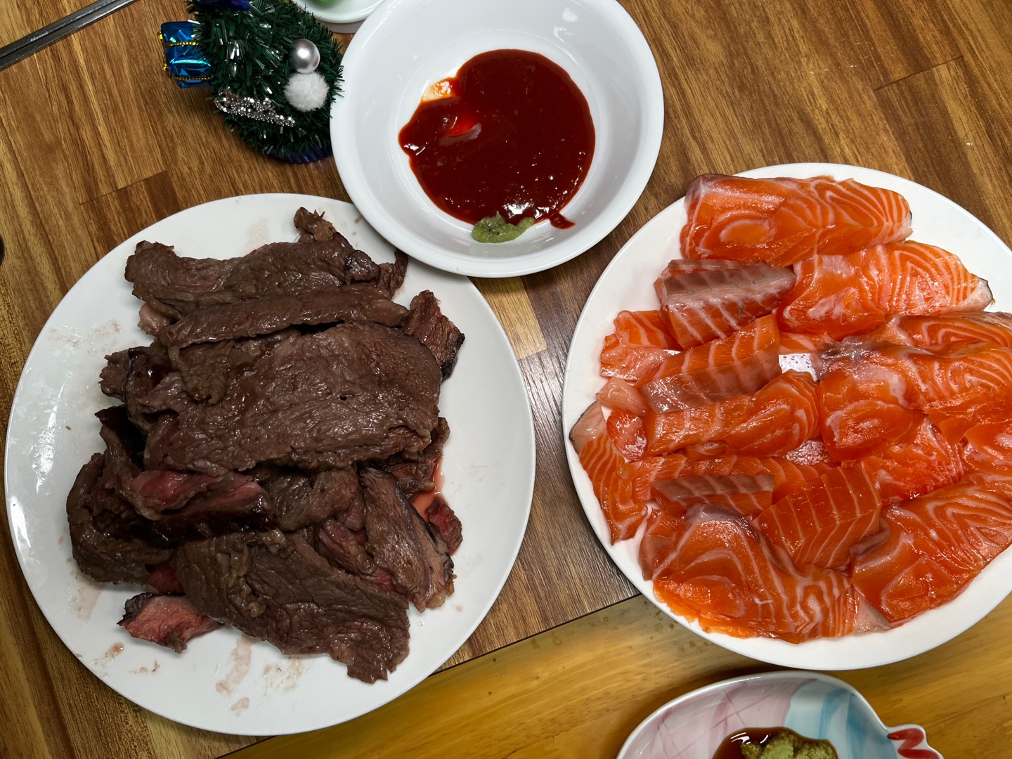 아무튼 크리스마스였으니까 고기는 적당히 잘라먹었습니다.