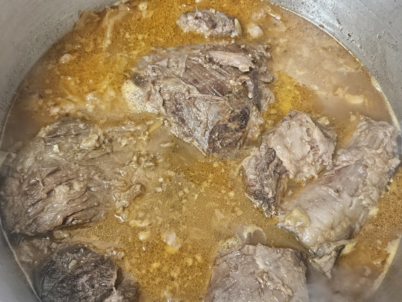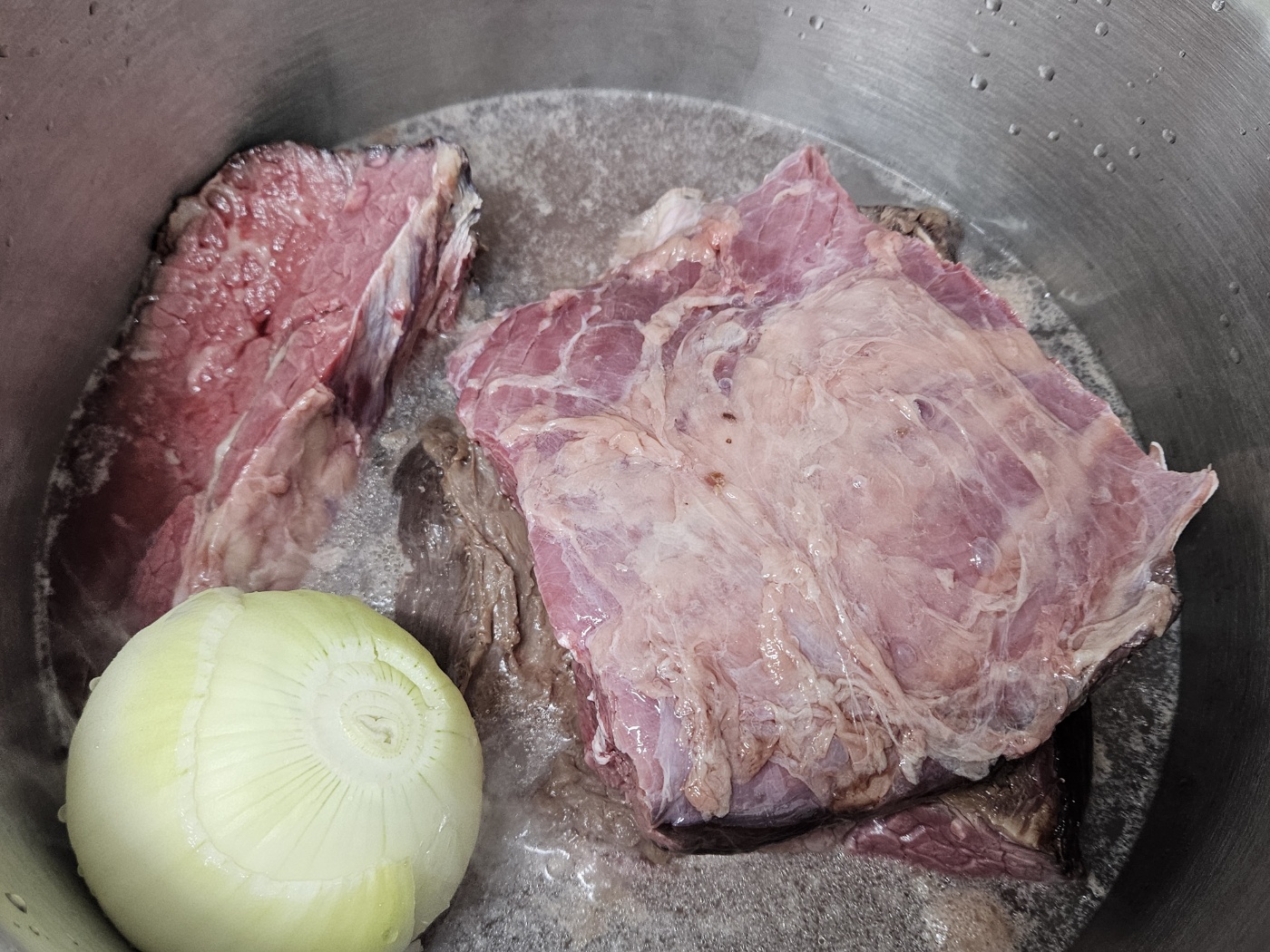 남은 고기는 삶았습니다. 양배추 한 통, 양파 2개, 각종 향신료 잔뜩, 토마토 주스 한 컵 정도?
