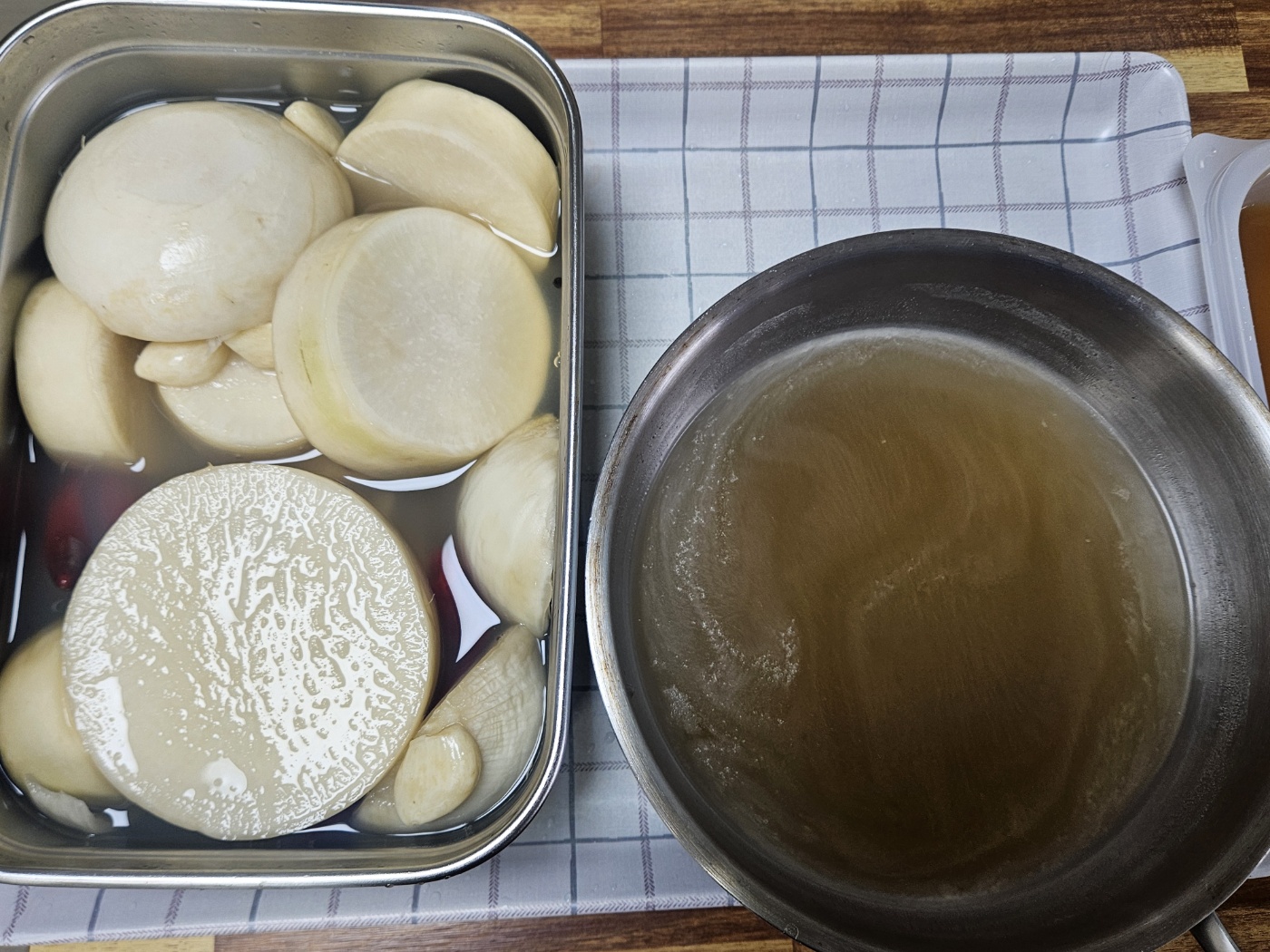 미리 담근 동치미 국물과 고기국물을 1:1로 섞습니다. 간장과 굴소스와 소금으로 간을 했습니다.