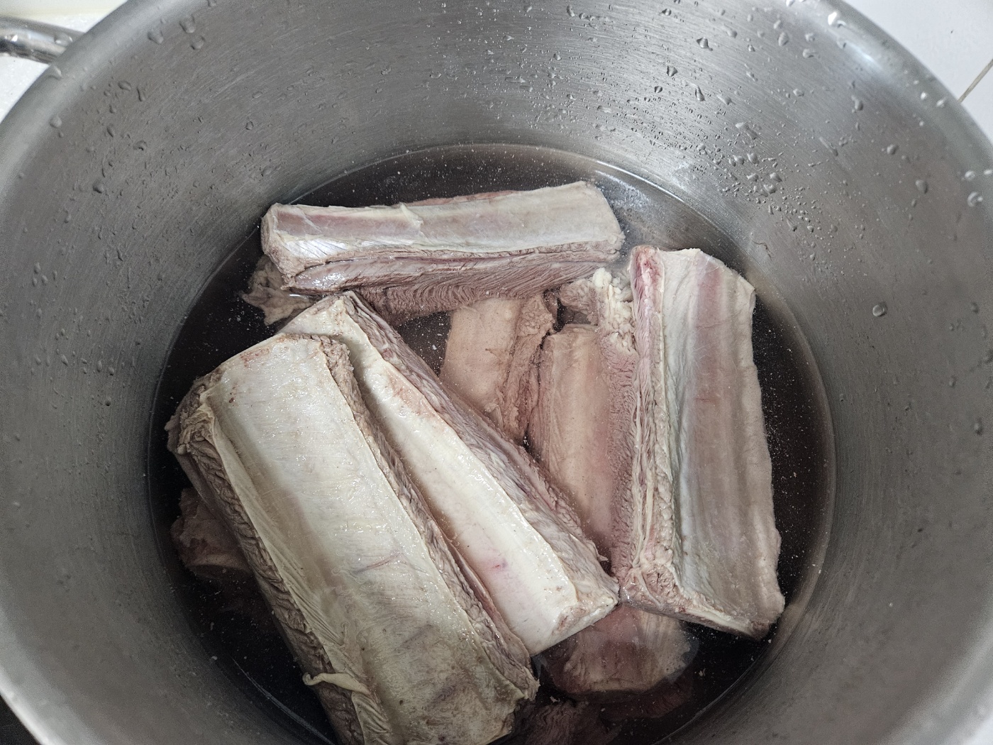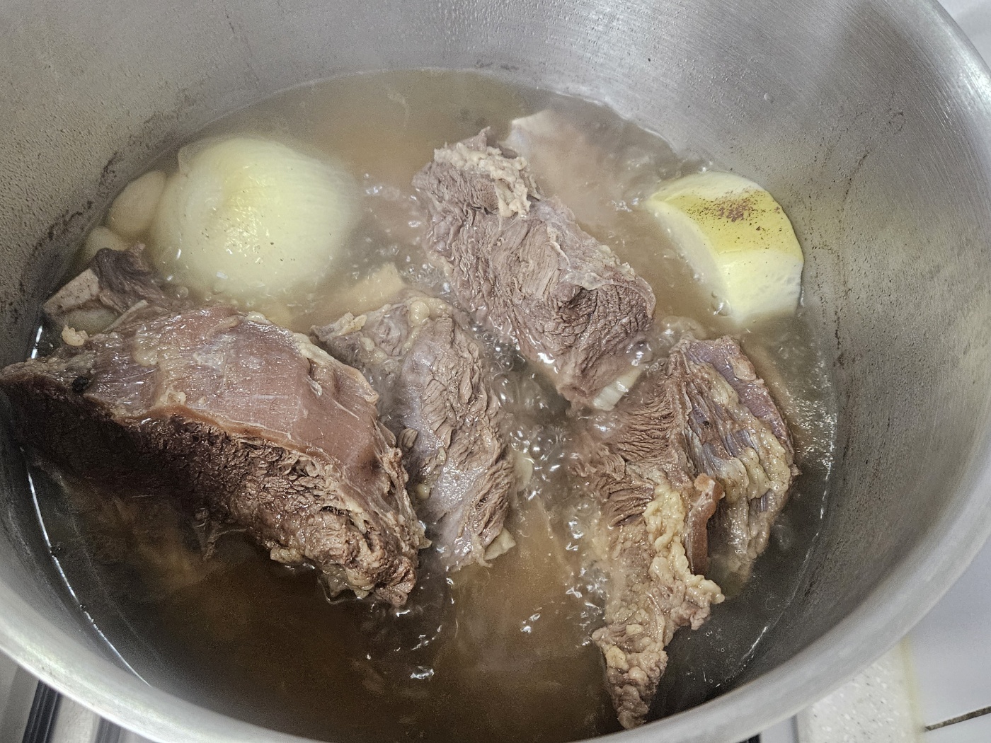 고기 손질하고 한번 데친 후에 무하고 양파 마늘 넣고 새로 삶습니다.