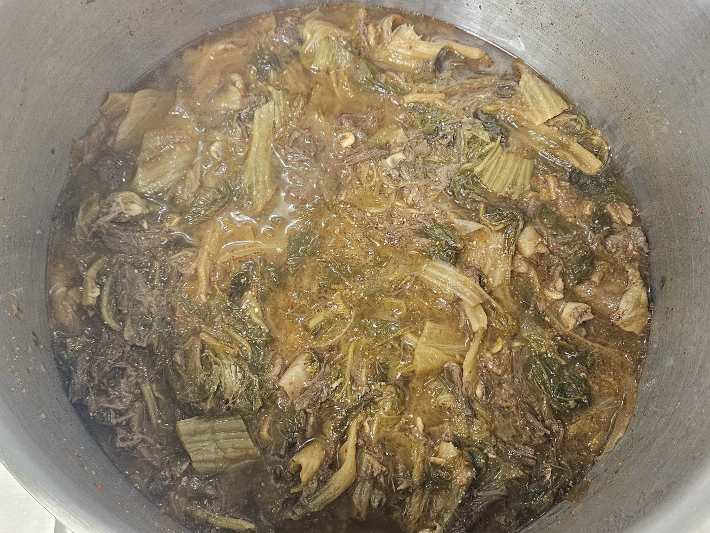 한 2시간 이상은 걸립니다. 이때쯤 되야 우거지에서 단맛이 우러나오면서 국물이 맛이 좋아집니다.