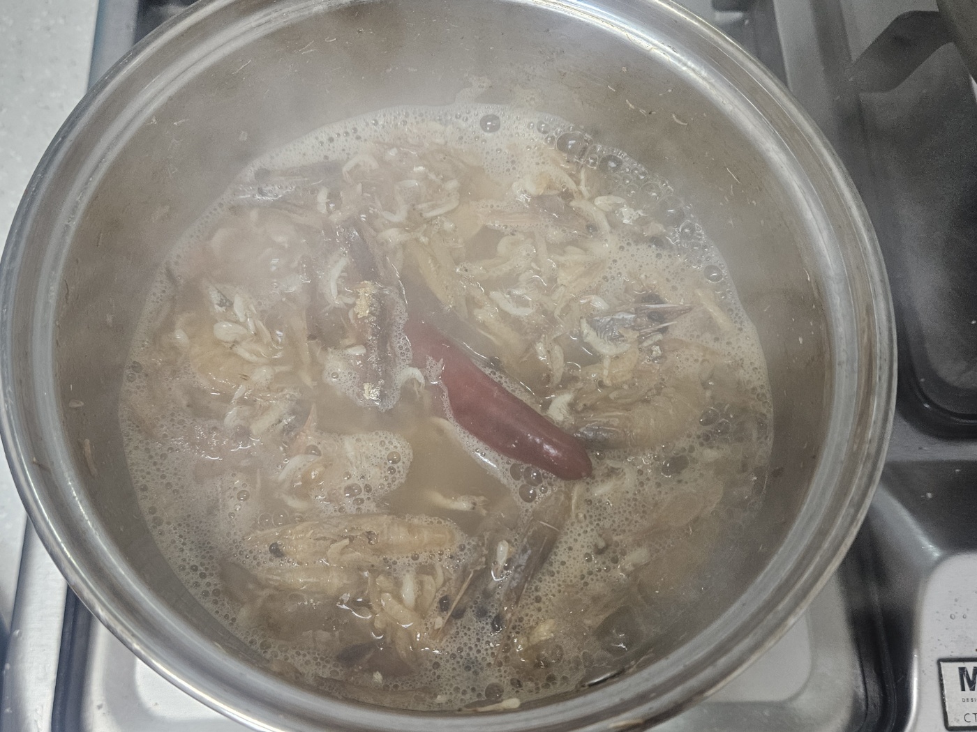 그래서 마른 멸치 구운 것과 마른 새우 구운 것, 마른 게, 김장용 생새우, 마른 고추를 넣고 해물 육수를 추가로 만들었습니다.
