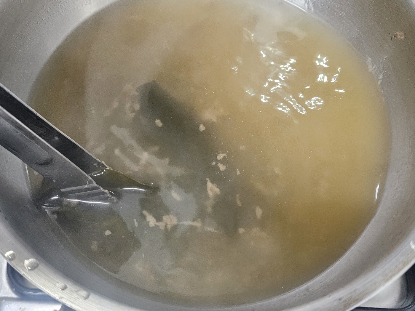 건더기를 거르고 육수만 따로 뺍니다. 다시마를 넣어서 맑게 할 수도 있는데,