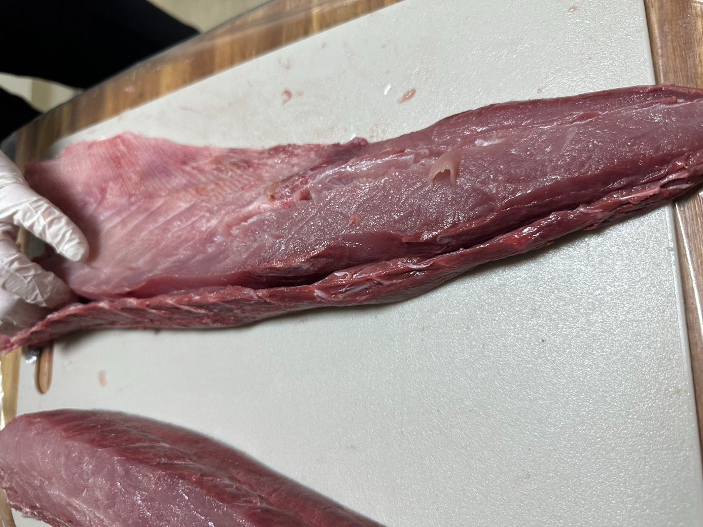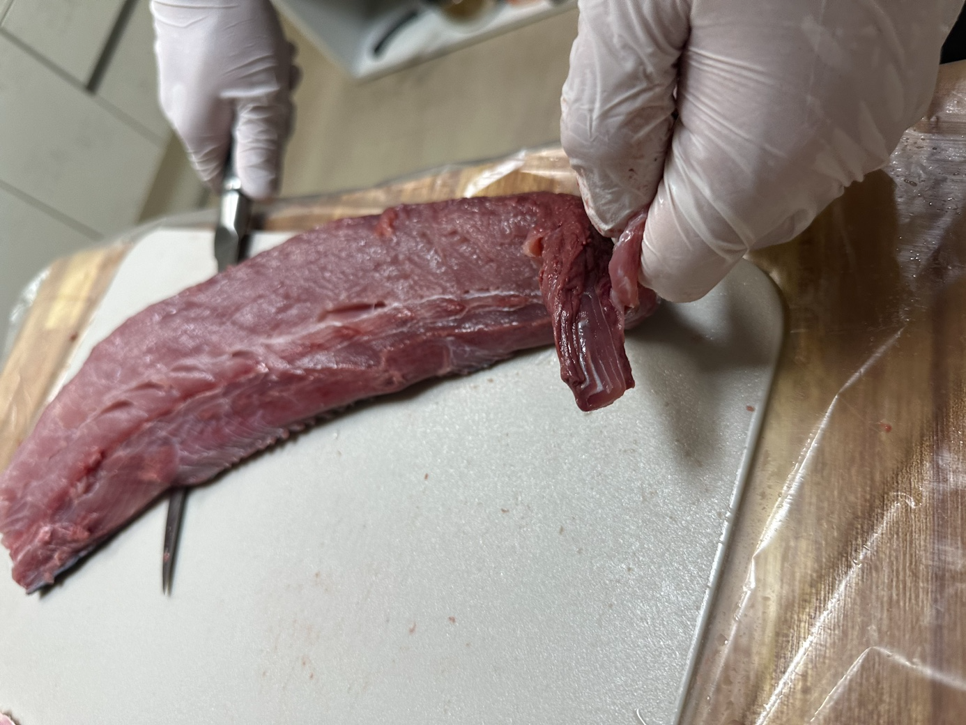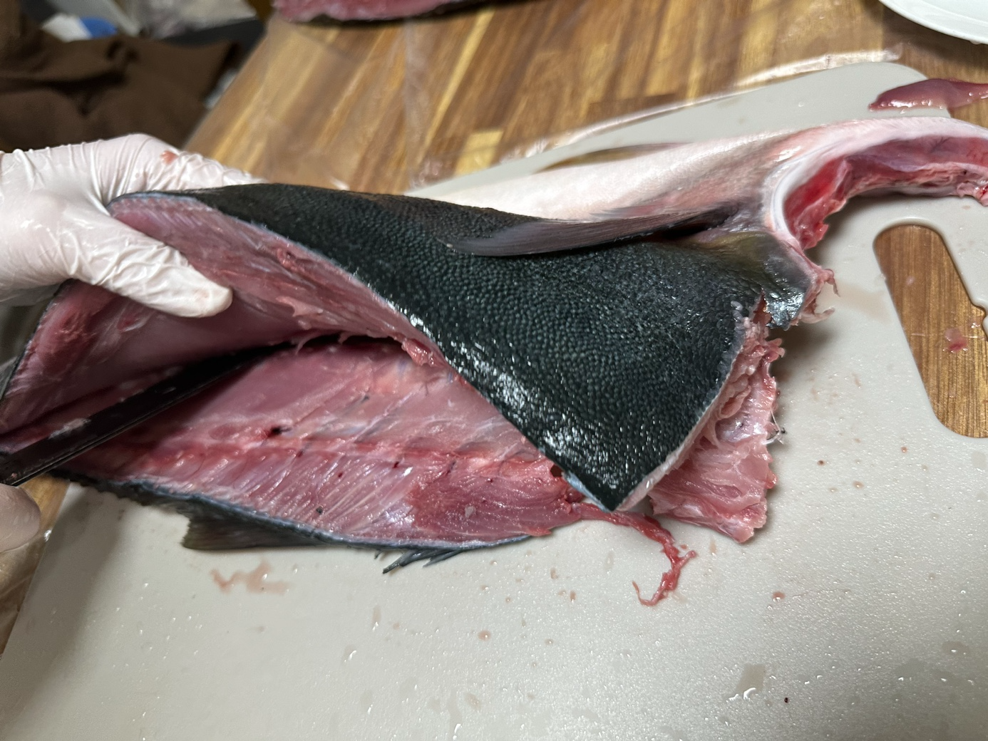 중심에 뼈가 박혀있는 부분이 있으니 위아래로 썰어서 뼈가 있는 부분을 제거합니다. 이 부분은 혈합육이 많은데, 버리기도 하지만, 먹을 수도 있습니다. 껍질은 그냥 당기면 벗겨집니다. 칼로 베어낸다는 느낌보다 가죽을 벗긴다는 느낌으로 잡고 당기면 됩니다.