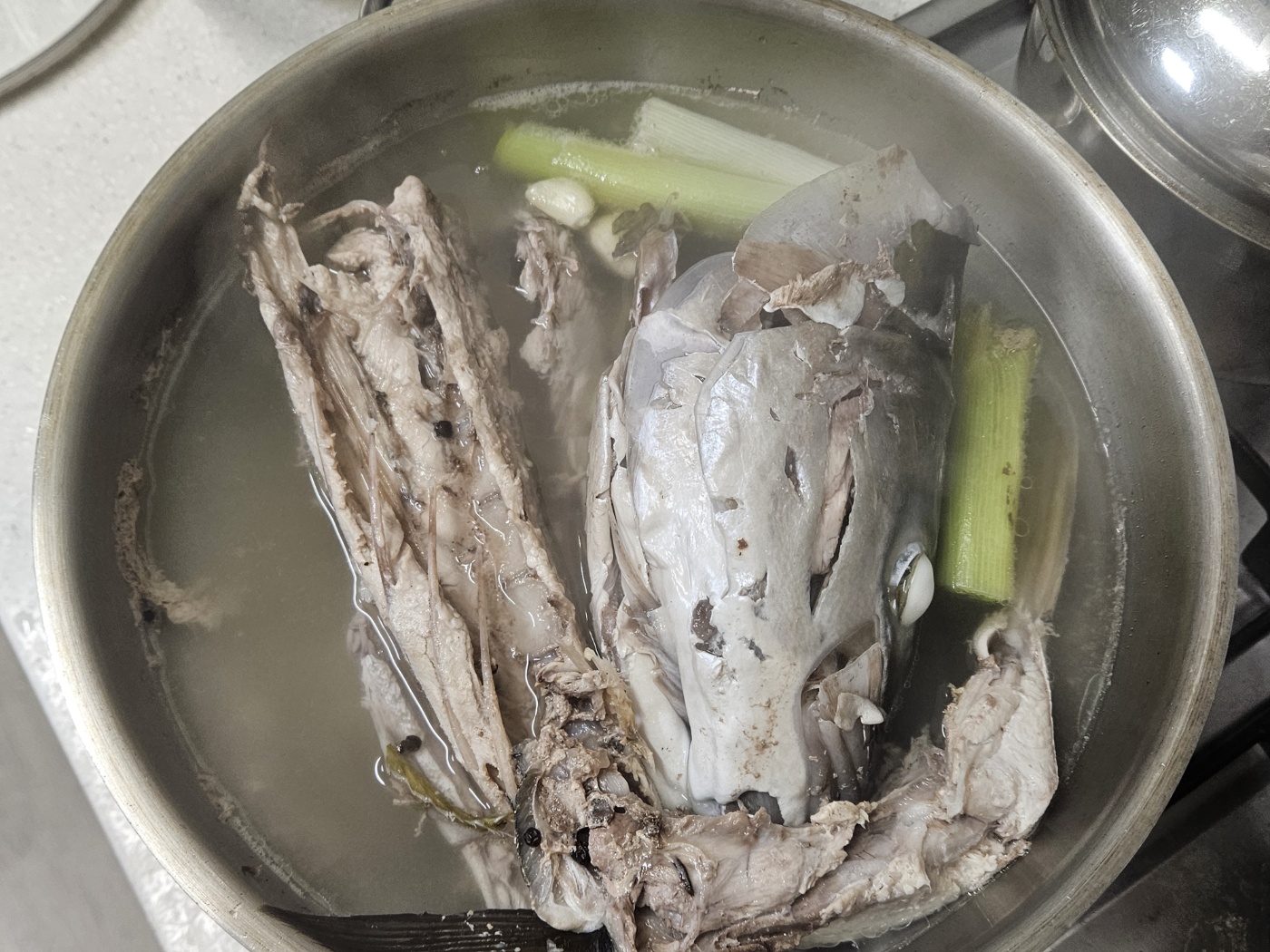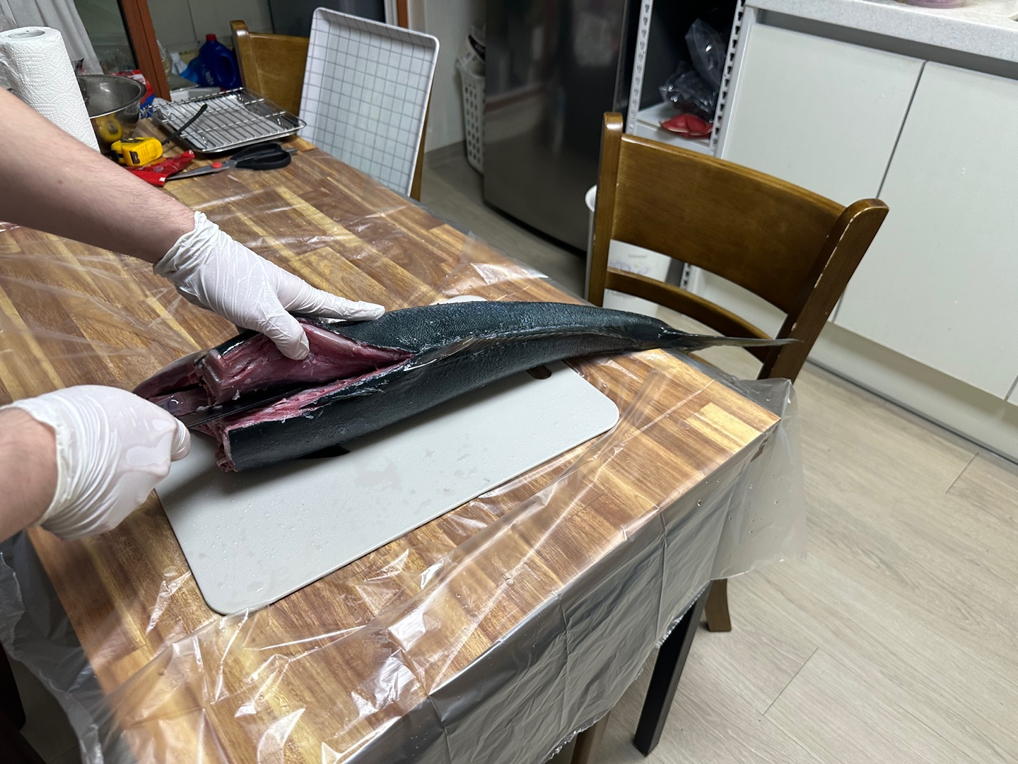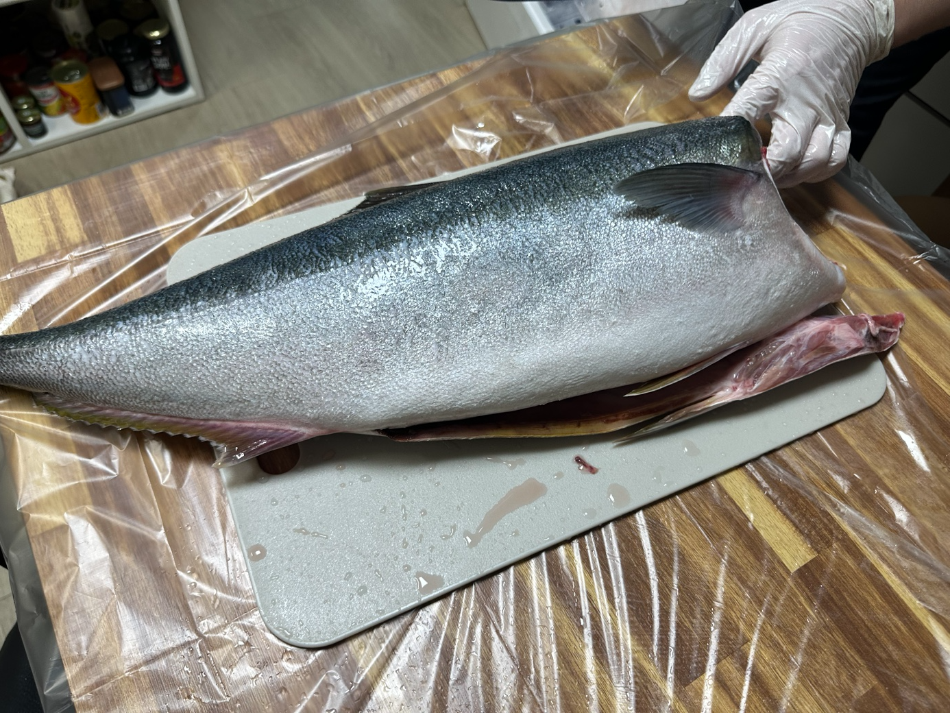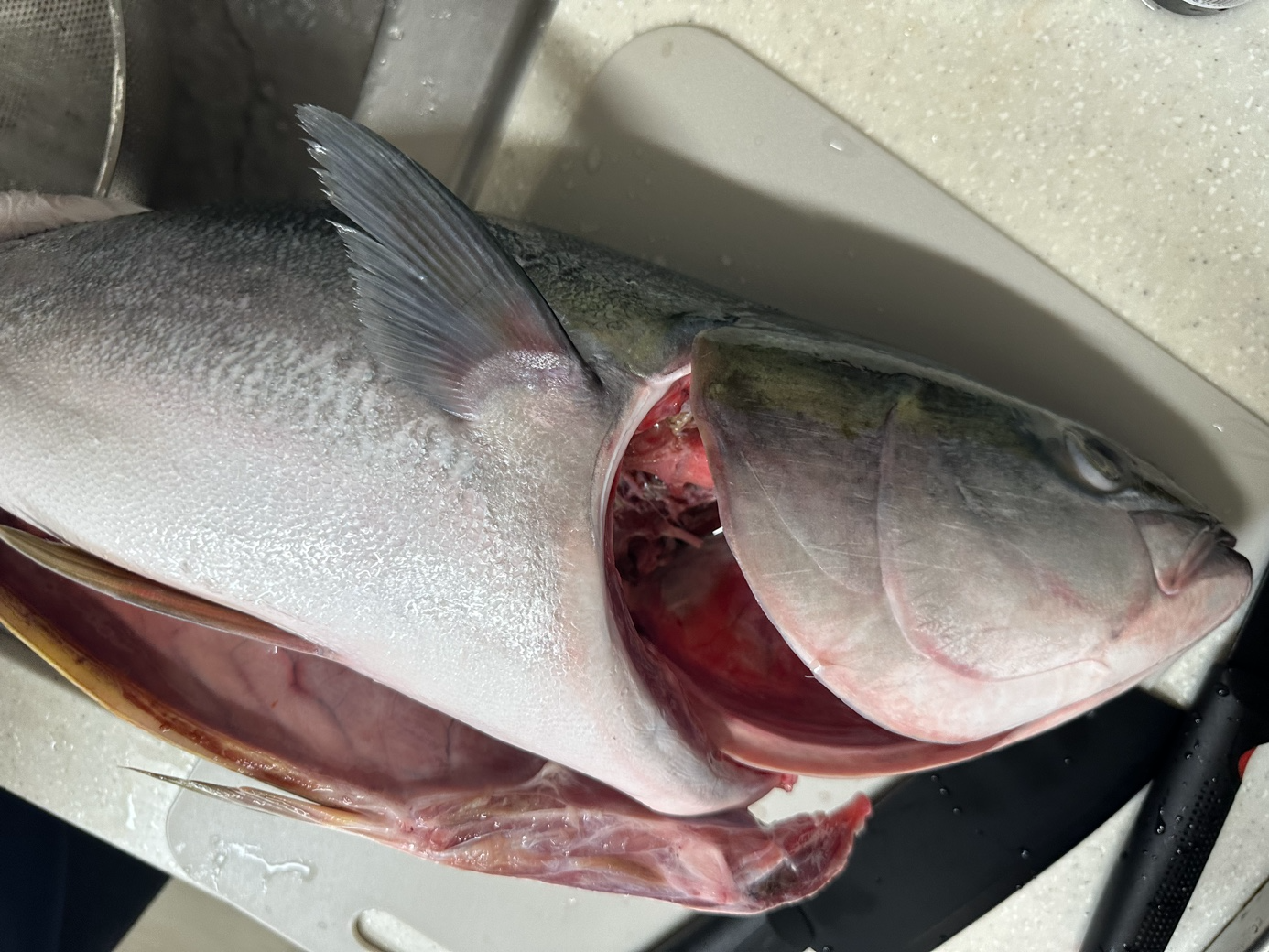 석장 뜨기를 할 겁니다. 등 쪽부터 칼을 넣었습니다. 비늘이 많고 가죽이 두꺼워서 힘듭니다.