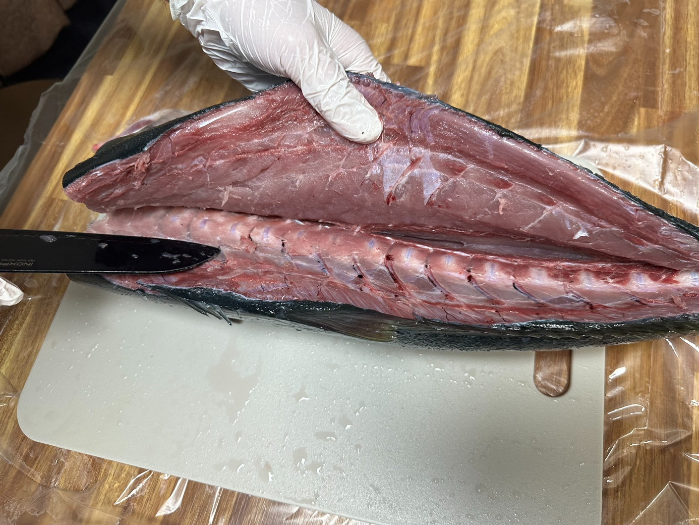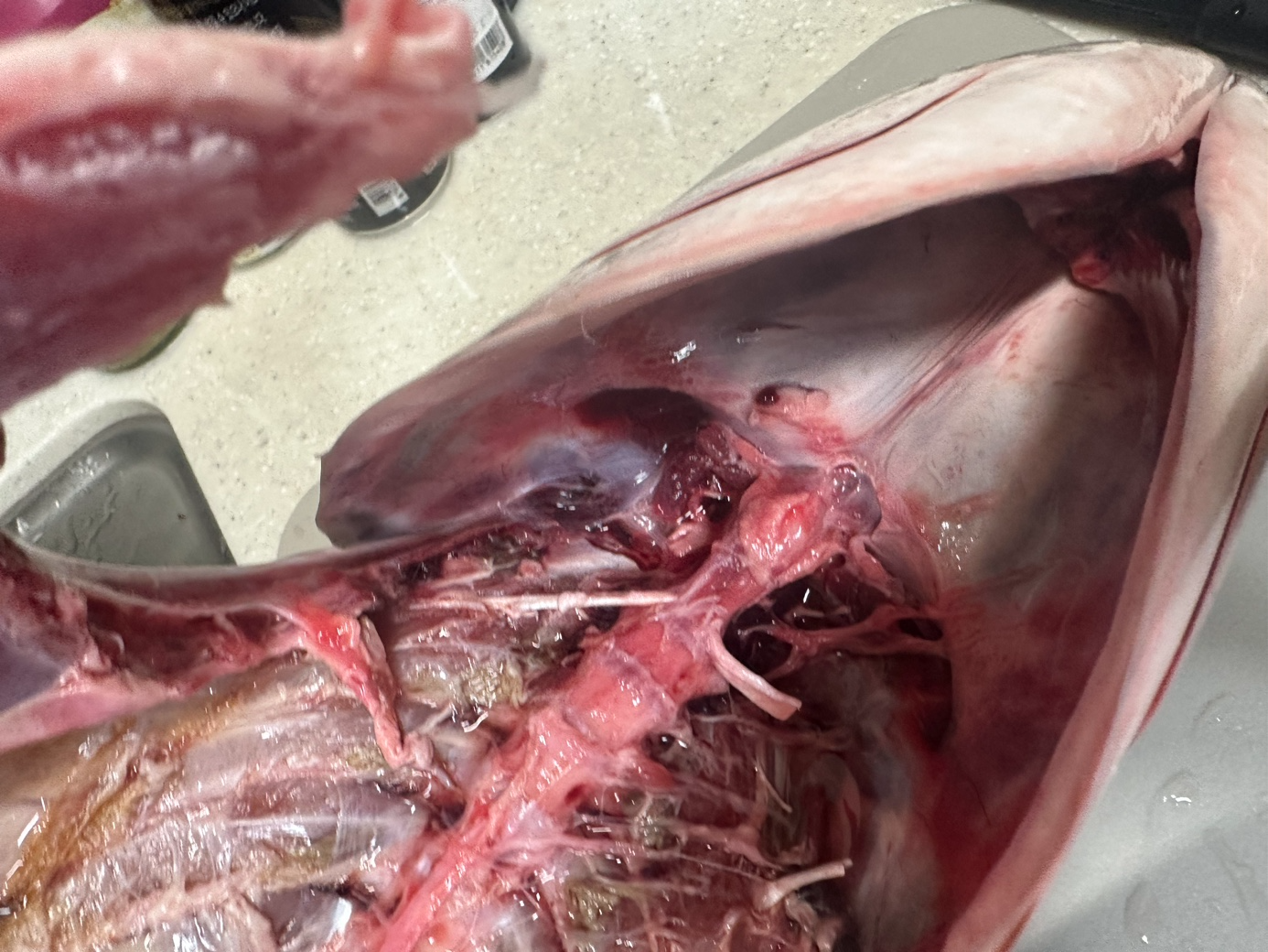 등뼈는 제거했고... 이제 갈비뼈와 잔뼈를 제거하고 껍질을 벗깁니다.
