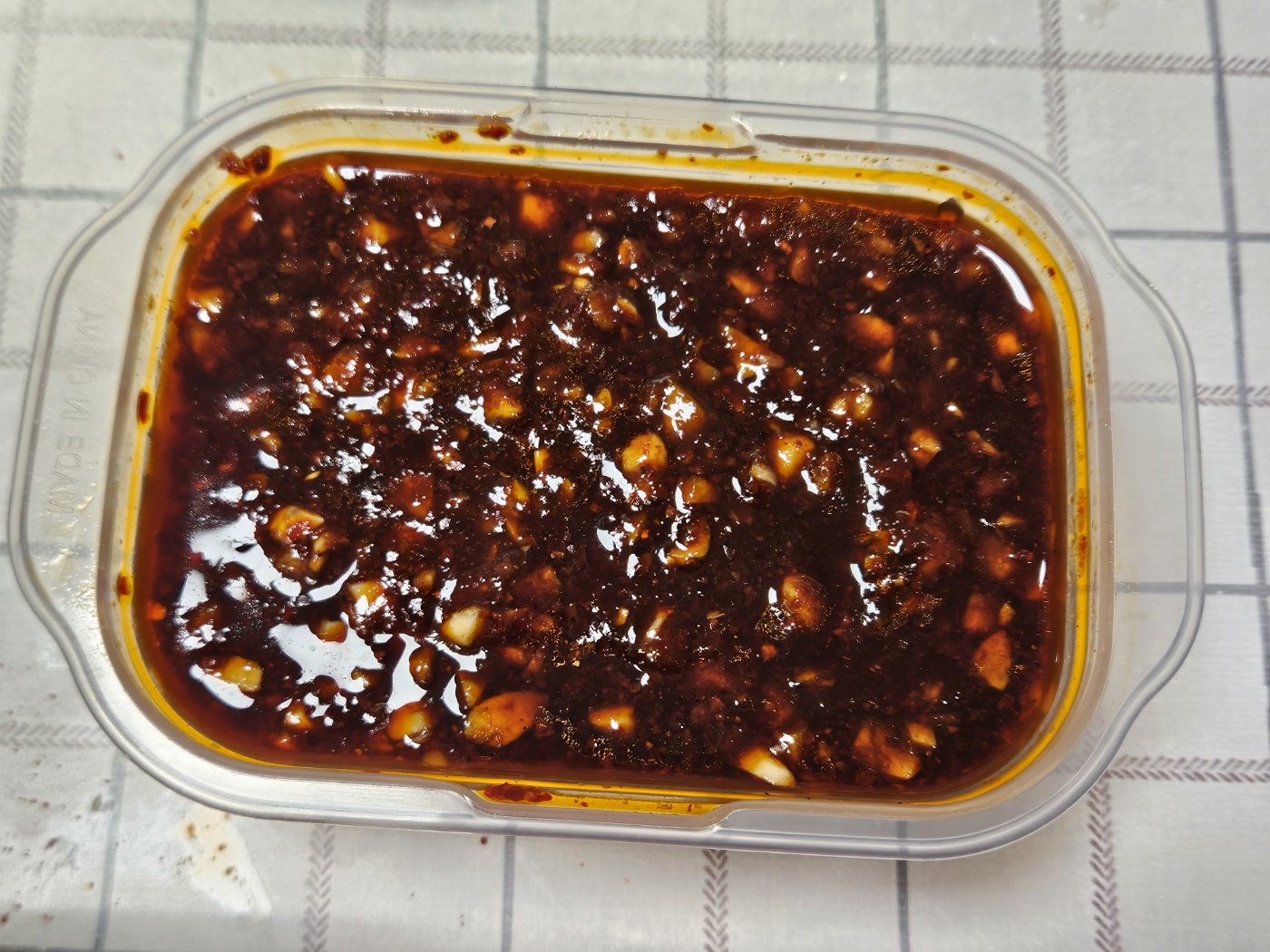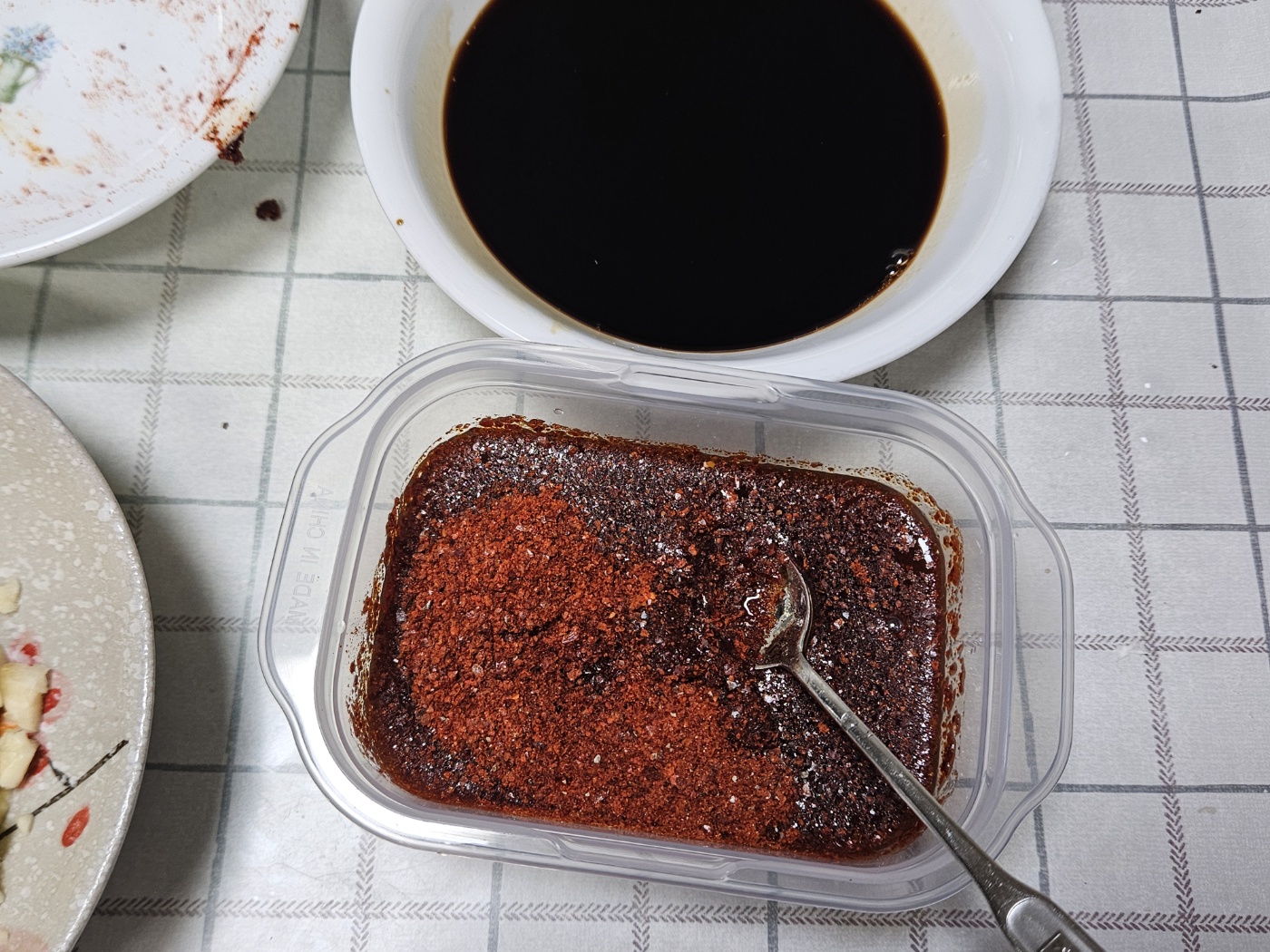 재료는 단순합니다. 고춧가루, 간장, 다진 마늘, 참기름입니다. ( 멸치 액젓이나 까나리 액젓이나 굴소스나, 후추나 다른 거 넣어도 됩니다. 단맛은 살짝 있는 편이 더 맛있으니까 설탕이나 단거 넣어도 됩니다.)