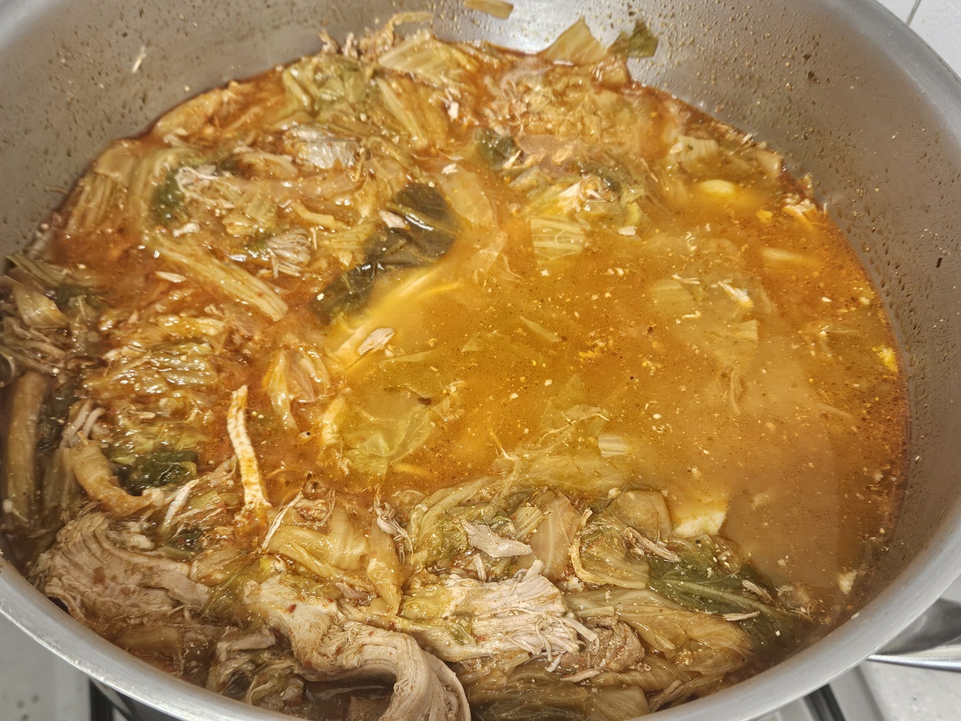 어느 정도 온도가 올라가고 잘 섞였으면, 고기와 국물을 넣고 계속 끓입니다. 한 30분에서 1시간 정도?..