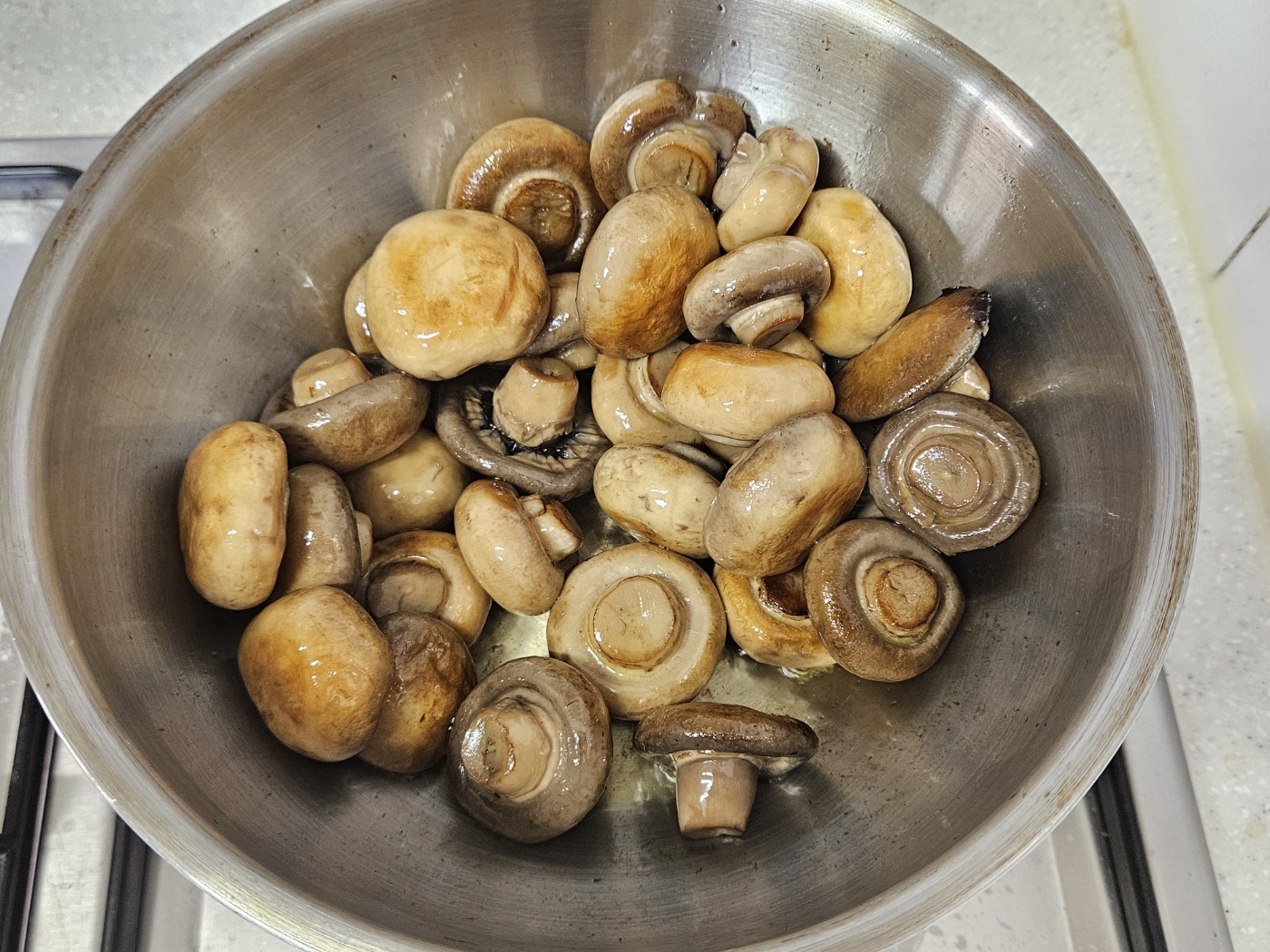 물을 조금만 넣고 삶습니다. 다 삶아지면 버섯과 물을 분리하고 물만 조립니다.