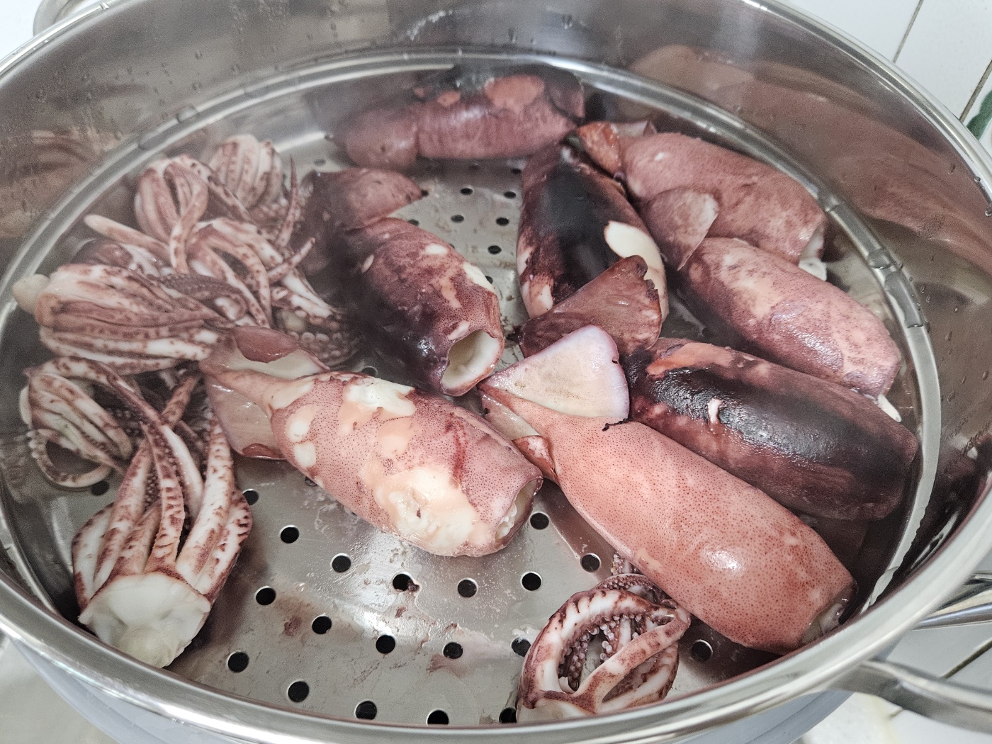 몸통과 다리를 찜통에 넣고 물을 조금만 넣고 10분간 찌고 5분간 뜸을 들입니다. 물에 삶아도 되지만, 찜통에 찌는 편이 오징어가 더 맛있습니다. 소스는 맛이 좀 떨어지지만...