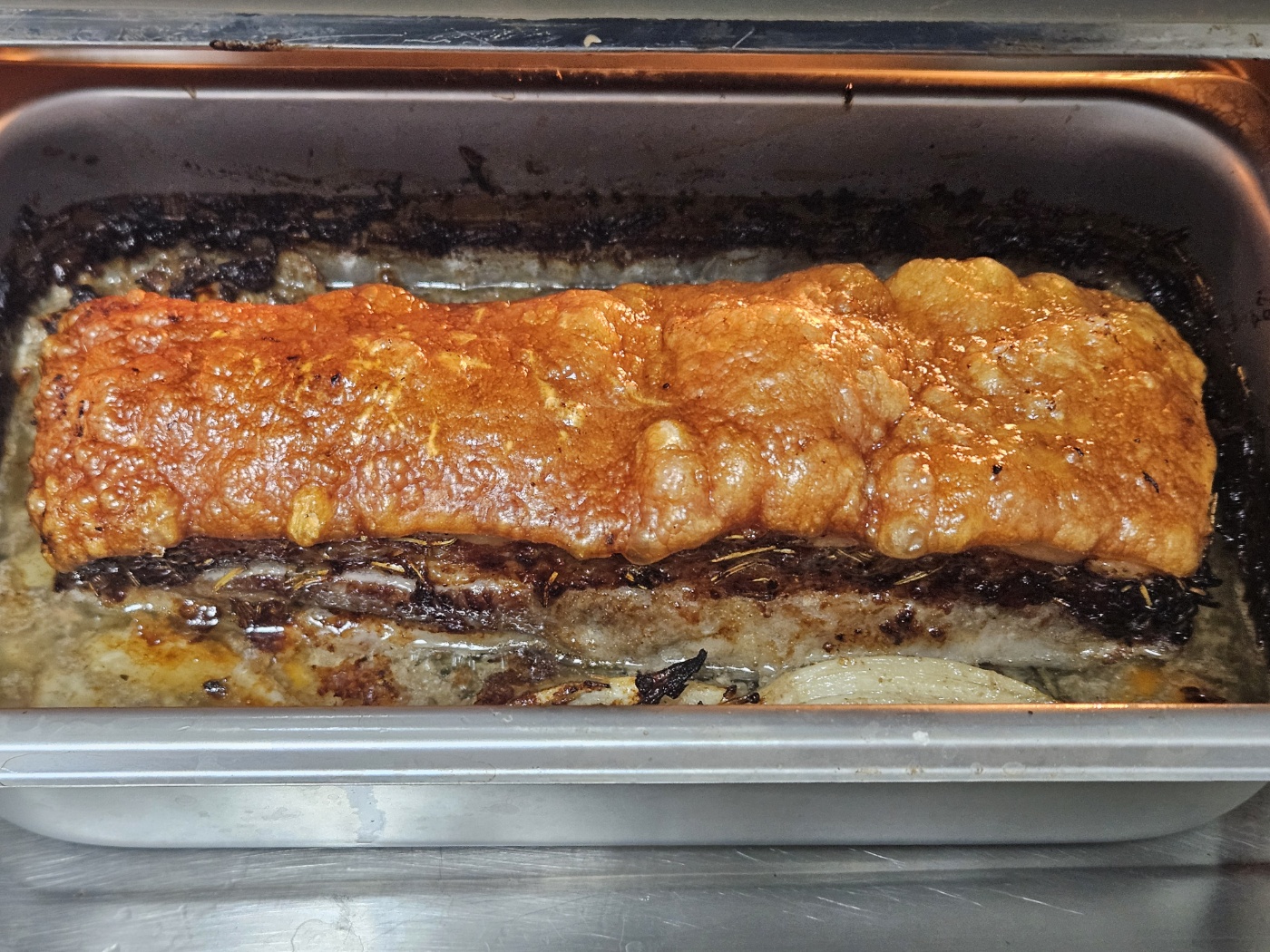 삼겹살의 살 부분은 물에 삶고, 껍질은 바삭하게 구워(튀겨?) 내는 요리입니다.