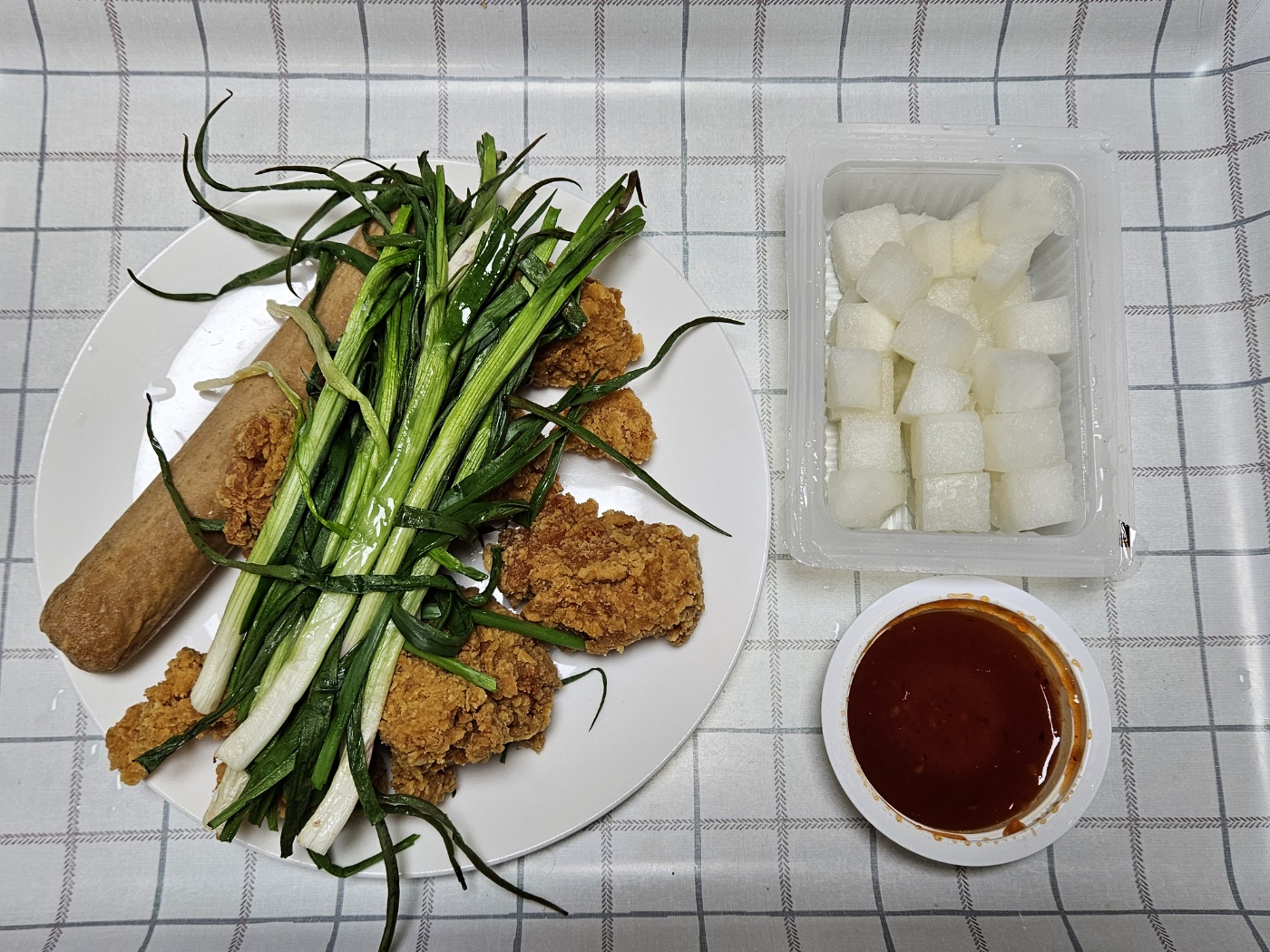 원래는 파전이나 할까 하다가 귀찮아서 소금 살짝 뿌려서 에어프라이어에 구워서 함께 사온 치킨 위에 얹어먹었습니다.