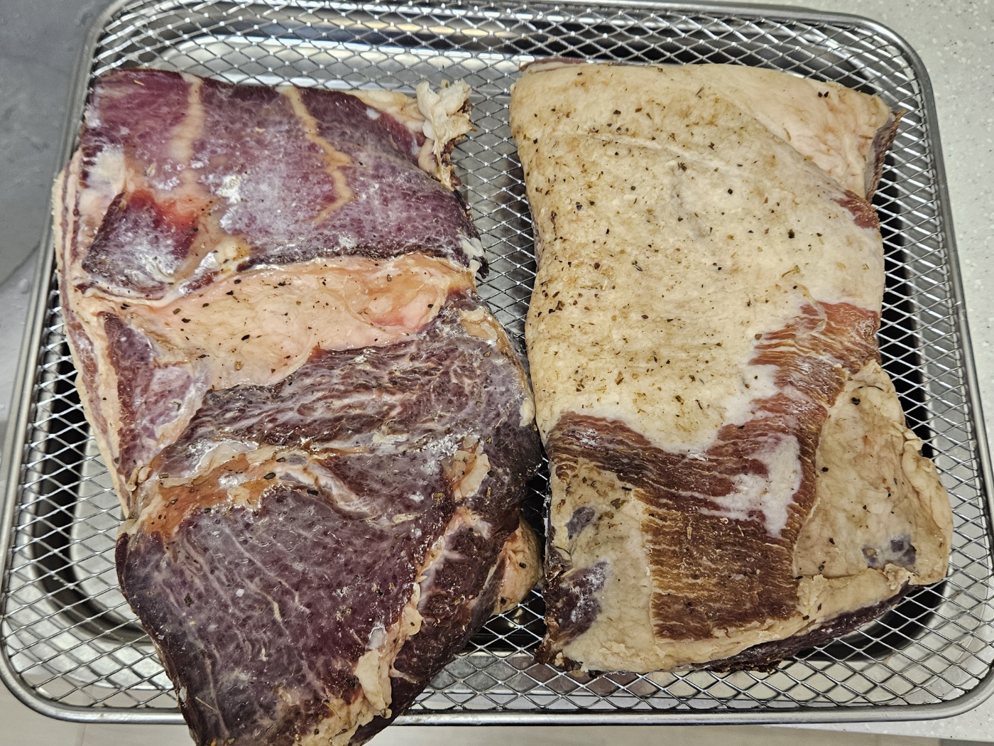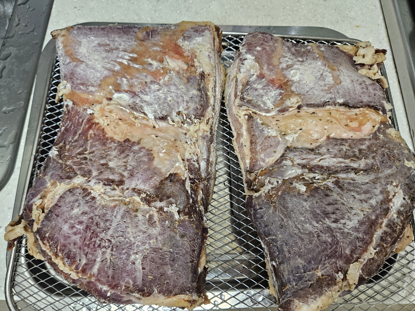 다만, 소금이 공기 중의 수분을 흡수하면서 녹아버리면 짠 물이 고기로 스며듭니다. 그래서 확인을 해야 합니다.