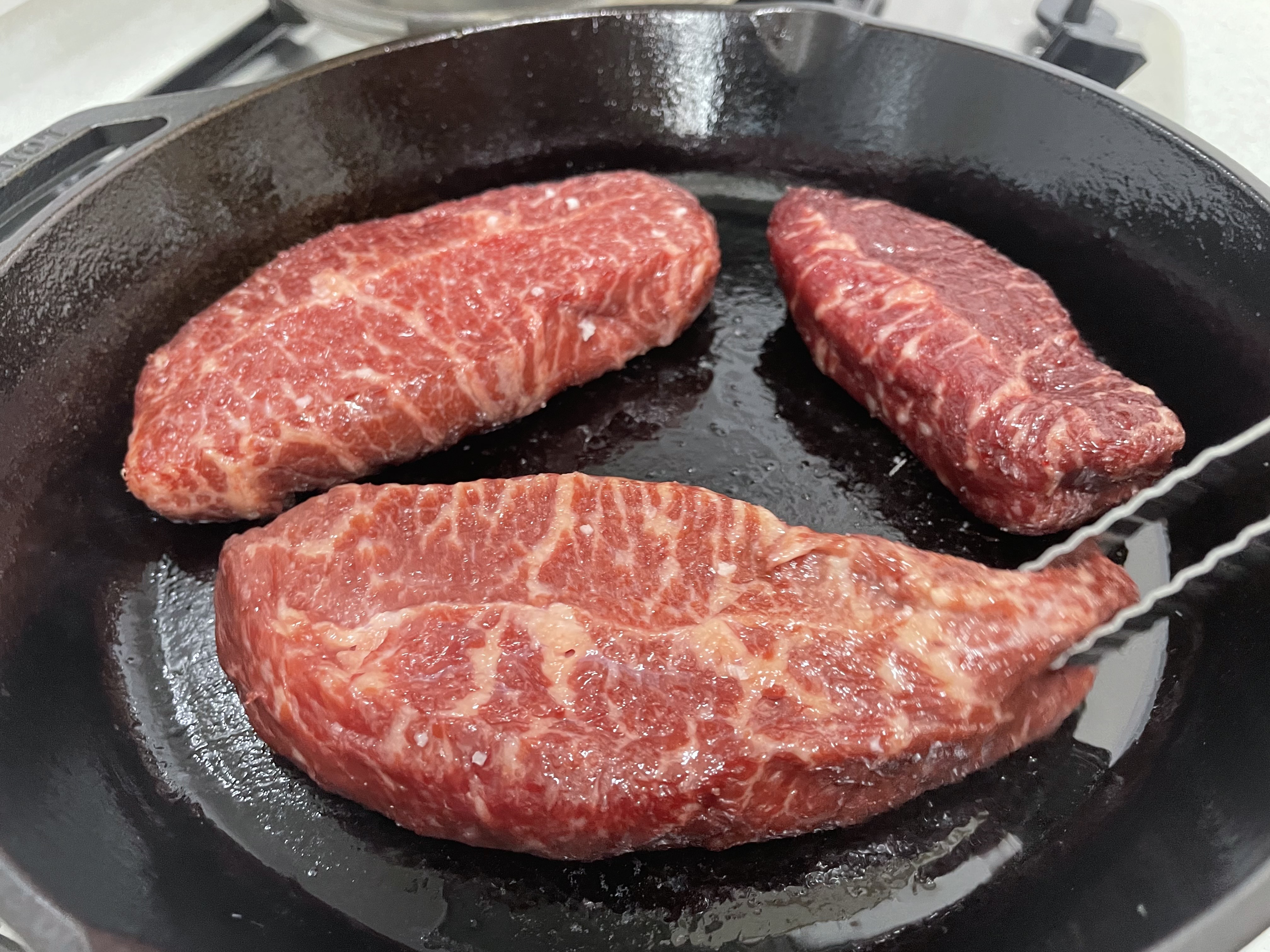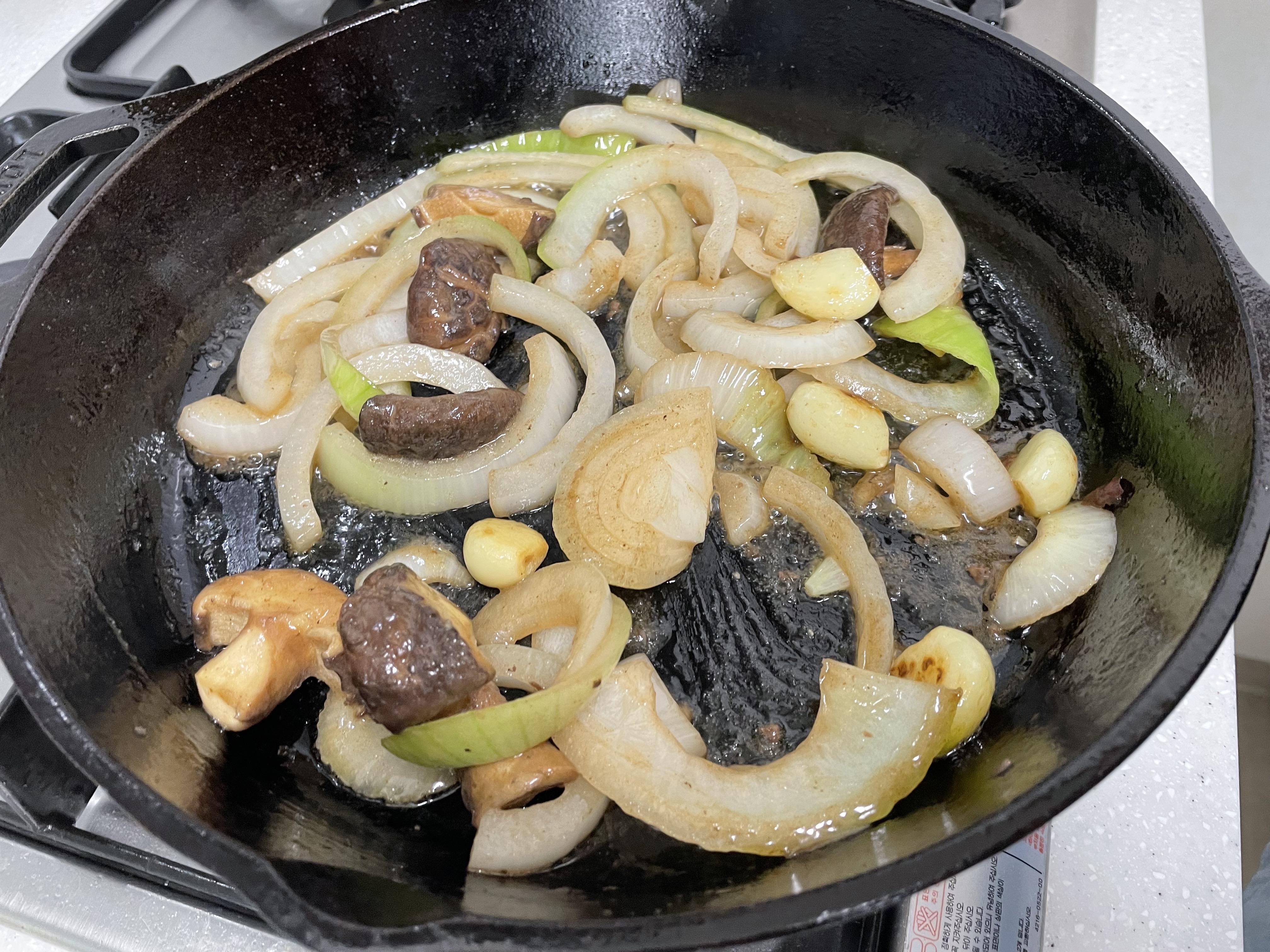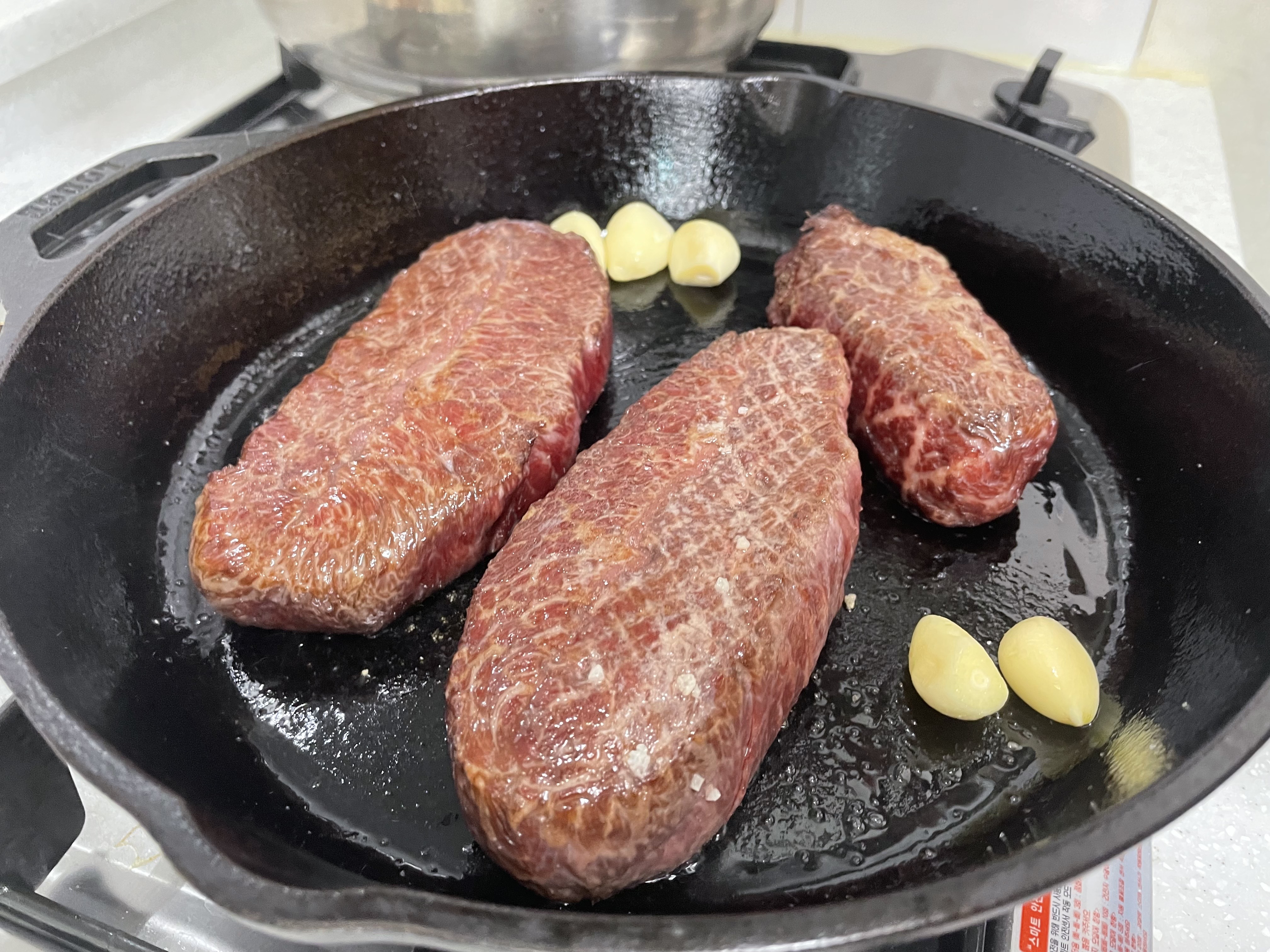 로지 무쇠 팬을 180도로 예열하고 카놀라 오일을 바르고 고기를 올려줬습니다. 1분마다 뒤집어가며 6분간 구웠습니다.