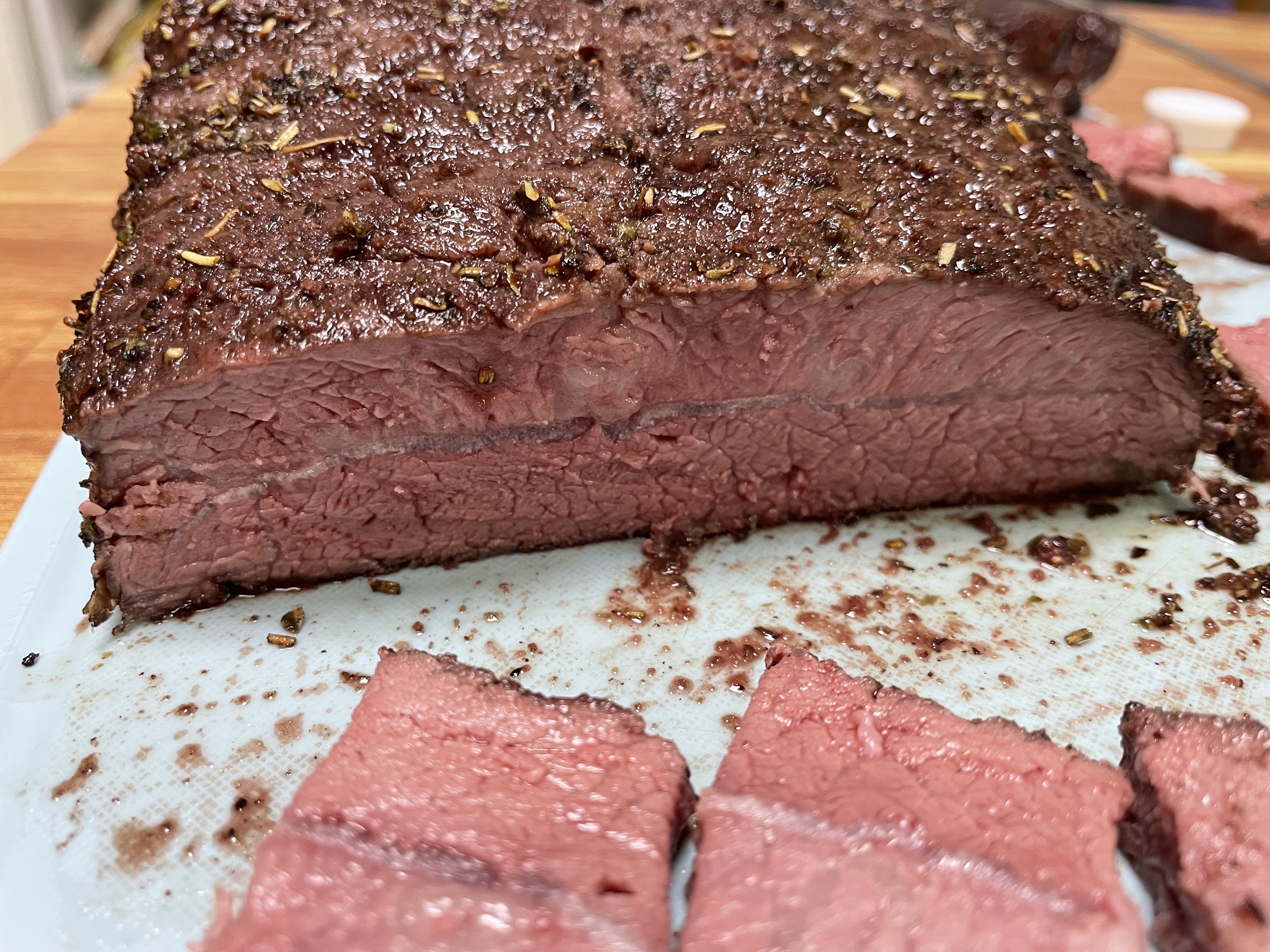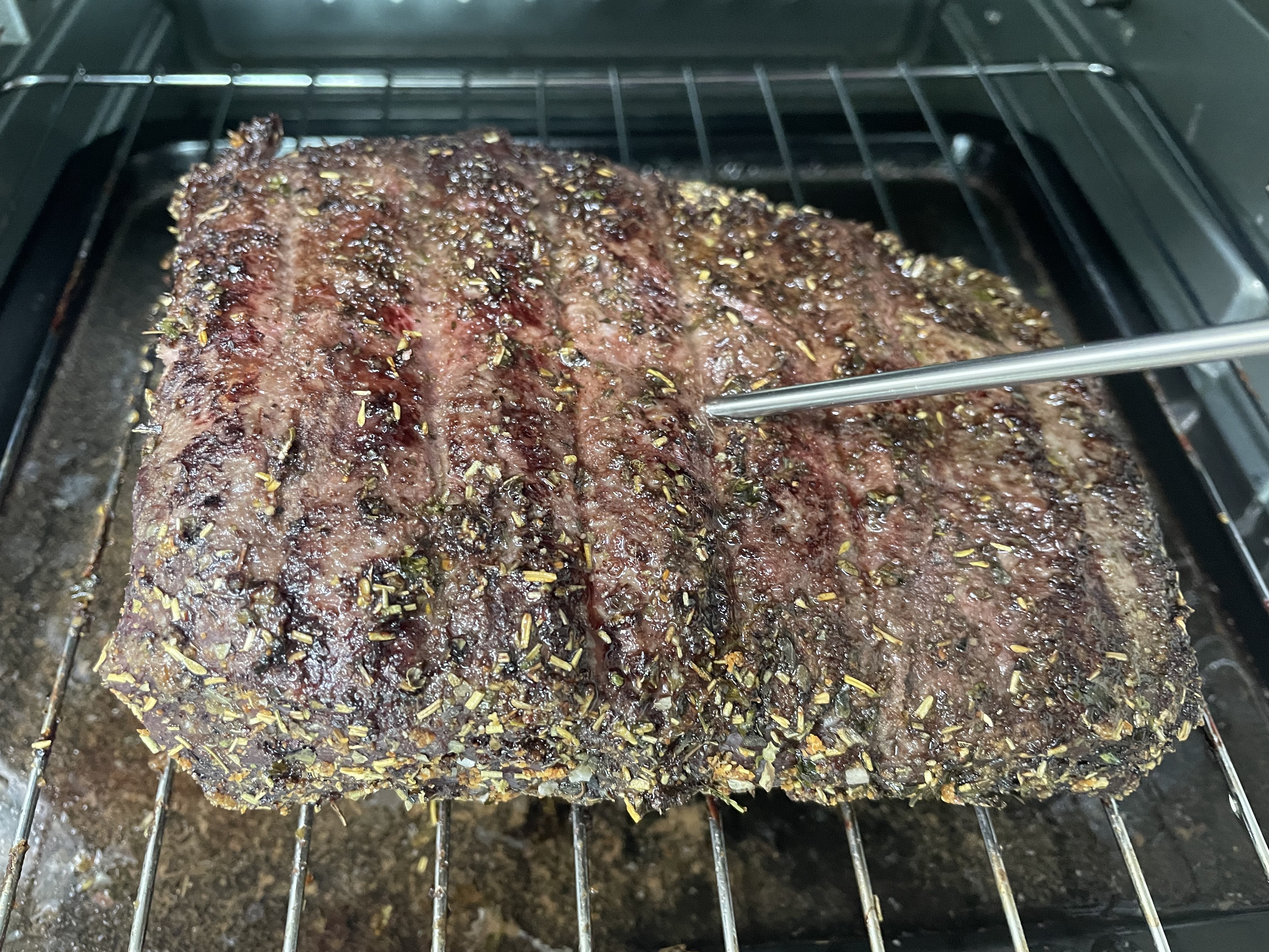 컨벡션 오븐을 사용해서 110도에서 2번 뒤집어가며 1시간 반 정도 구워줬습니다. 심부온도는 51도였습니다.