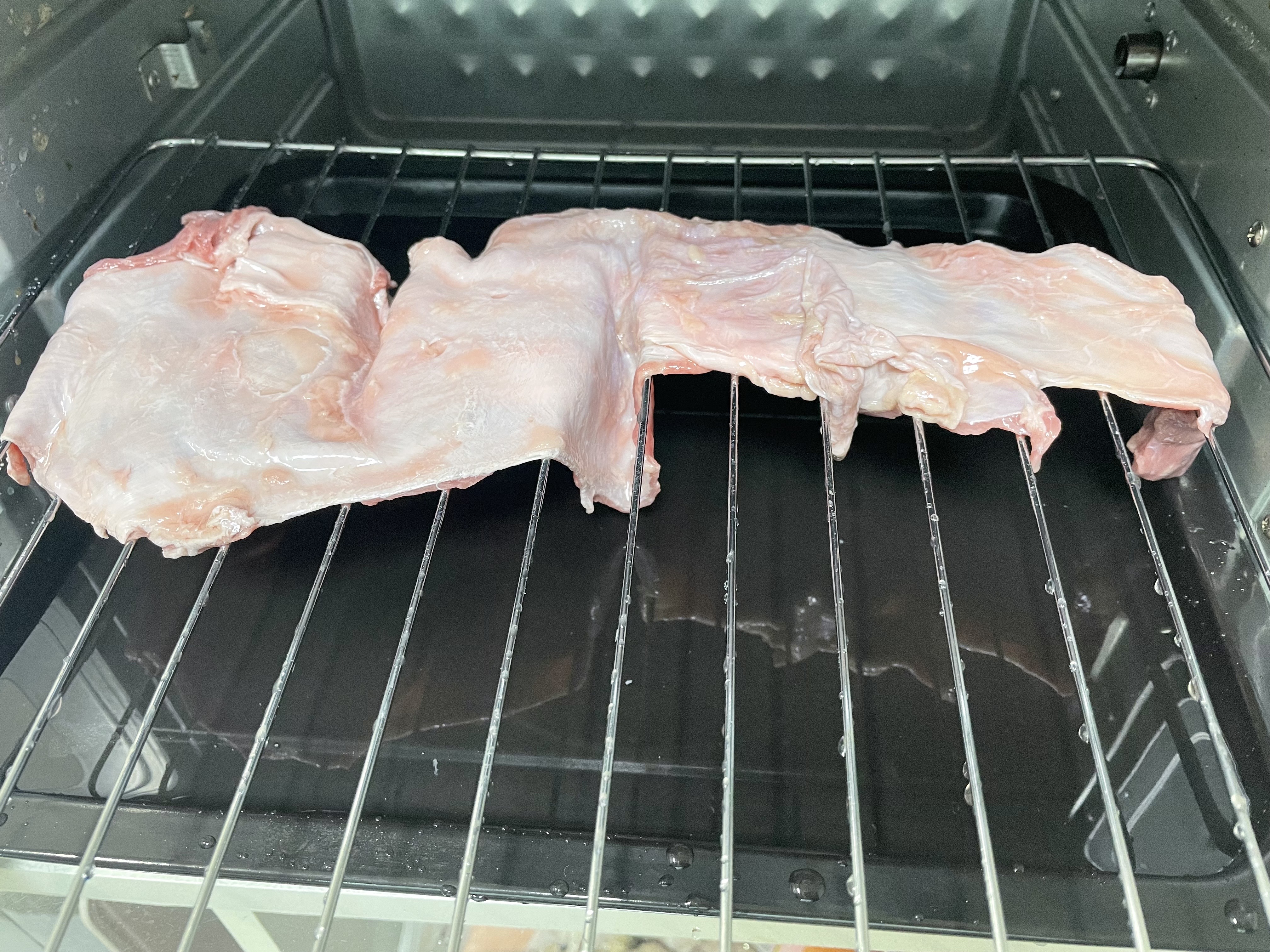 건조기로 고기를 1시간 정도 건조시켜줬습니다. 대충 사진 보시면 살짝 마른 것이 보일 것입니다. 두께는 2cm입니다.