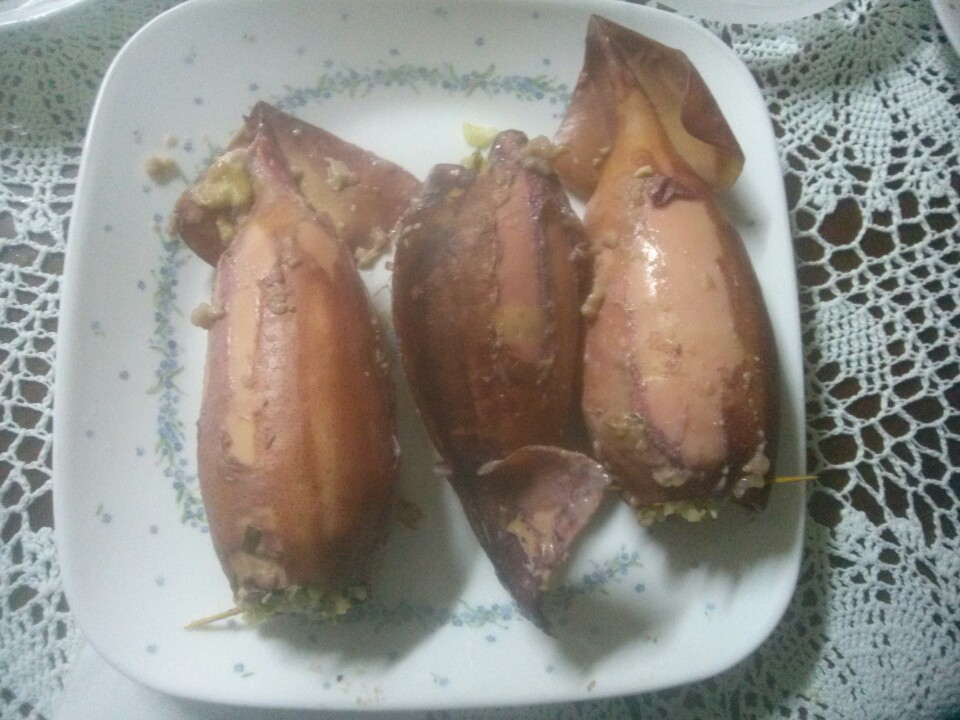 오징어순대는 오징어 배를 가르지 말고, 내장과 다리를 꺼낸 후, 불린 찹쌀, 다진 채소류, 오징어 다리를 오징어 배 안에 넣고 40분 정도 쪄줍니다. 사진에선 소에 계란을 넣어서 좀 더러워진 것 같네요.