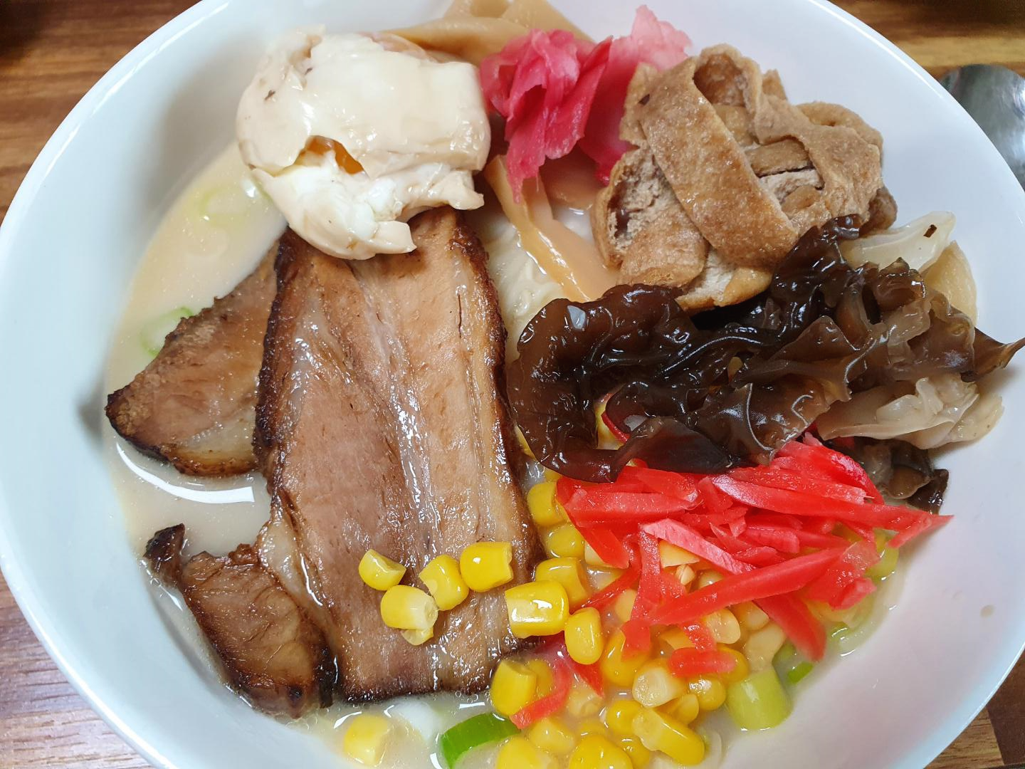 고명은 파, 구운 차슈(에어프라이어에 10분), 계란, 죽순, 초생강 1, 초생강 2, 유부, 목이버섯, 스위트콘을 사용했습니다.