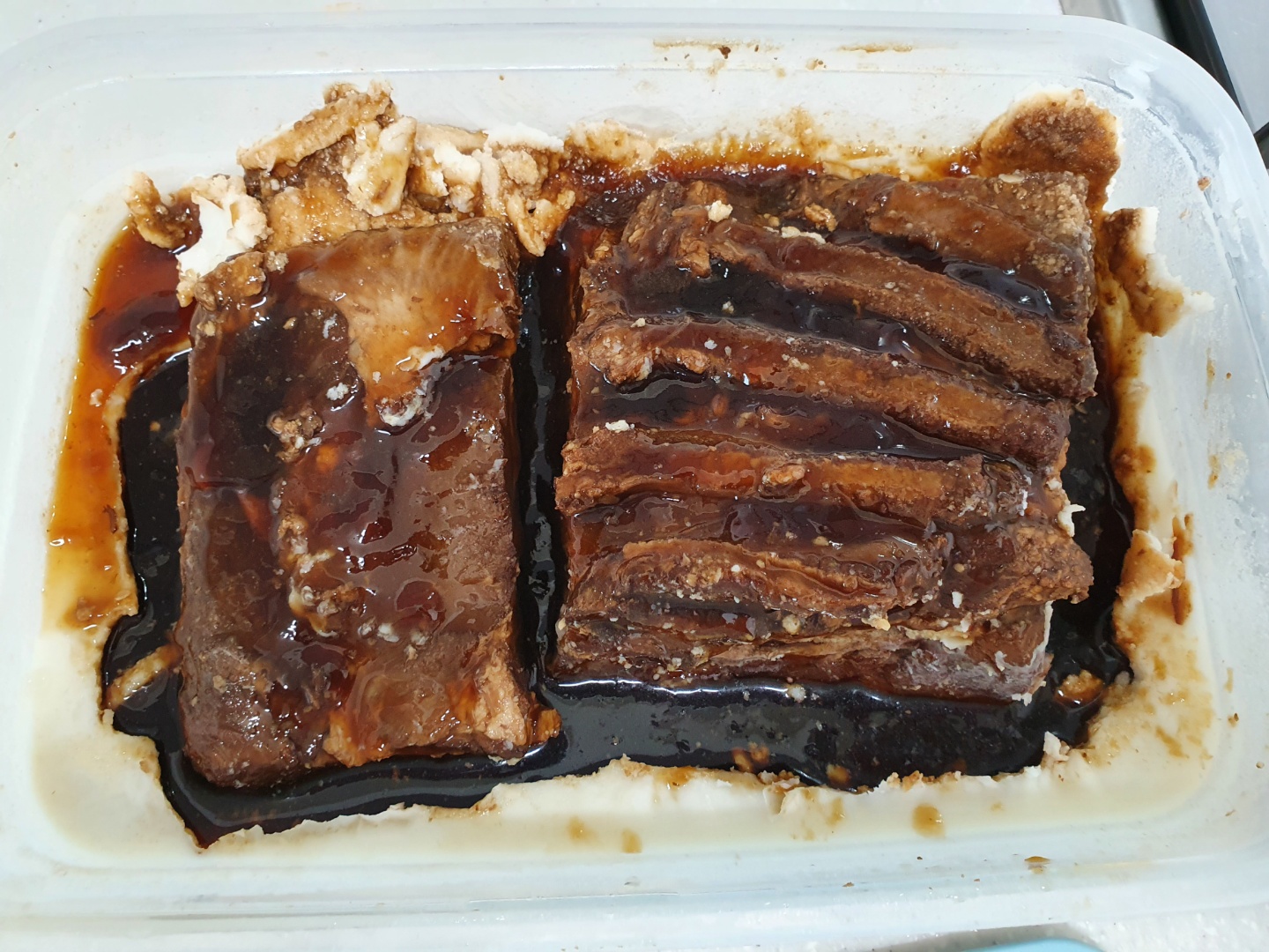 4. 고기가 식으면 통에 (걸러낸)국물과 함께 담아서 냉장고에 보관합니다.
