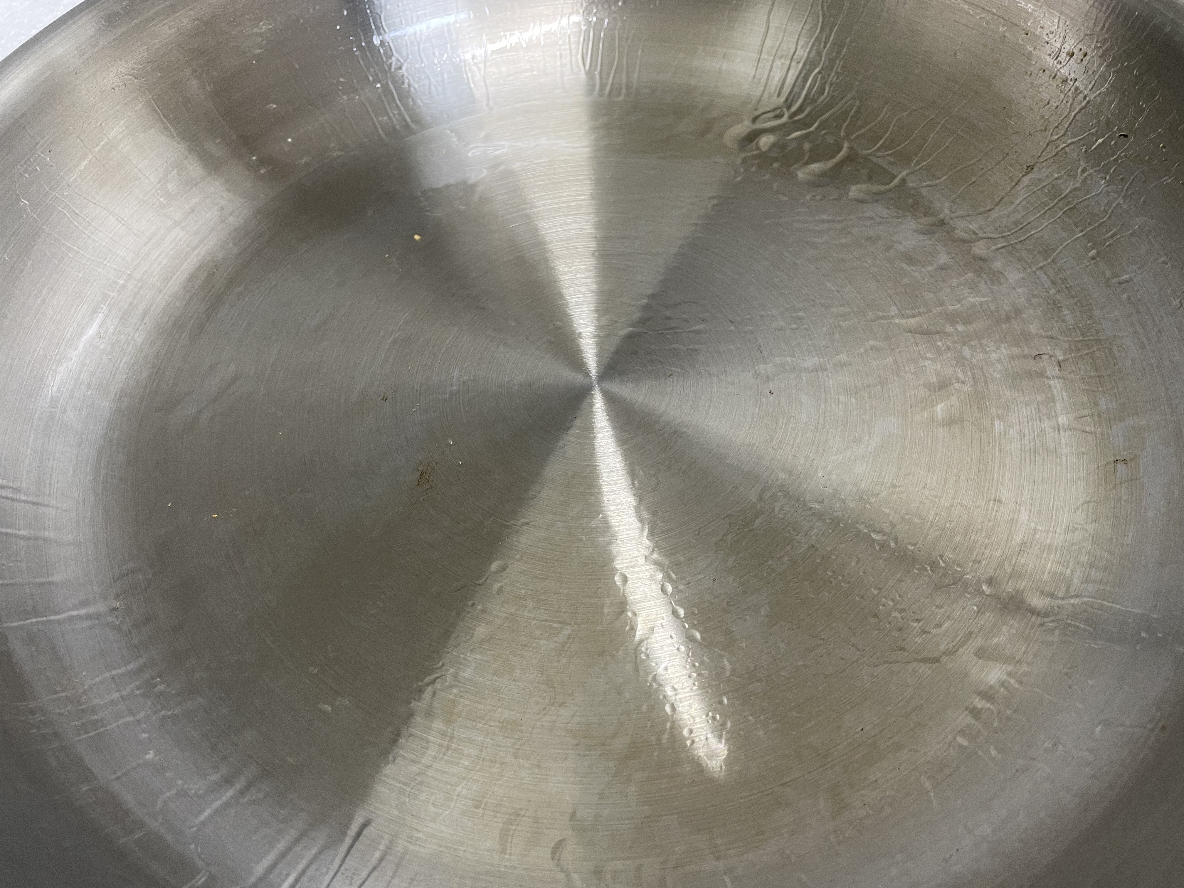 요리 후 스탠 팬의 모습입니다. 전혀 달라붙지 않았습니다. 대충 추정 온도 160도 이상으로 예열하고 기름을 넣으면 (기름에서 연기가 살짝 나려고 하는 느낌이 드는 온도) 계란이건 밥이건 고구마 건 달라붙지 않습니다. 물방울 굴러다니는 온도 정도로는 안되네요. 기름에 연기가 나는 게 싫어서 가능한 낮은 온도를 찾아보고 있는데 쉽지 않네요. 스탠 팬은 광택 때문인지 적외선 온도계 하고 잘 안 맞는 것 같습니다. 지금은 대충 눈으로 기름 상태를 보면 달라붙을지 안 달라붙을지 느낌이 오니까 느낌으로 하고 있습니다. 기름을 팬에 부었을 때 좀 쭈글쭈글한 무늬가 생기는데 이런 경우에 잘 달라붙지 않는 것 같습니다.