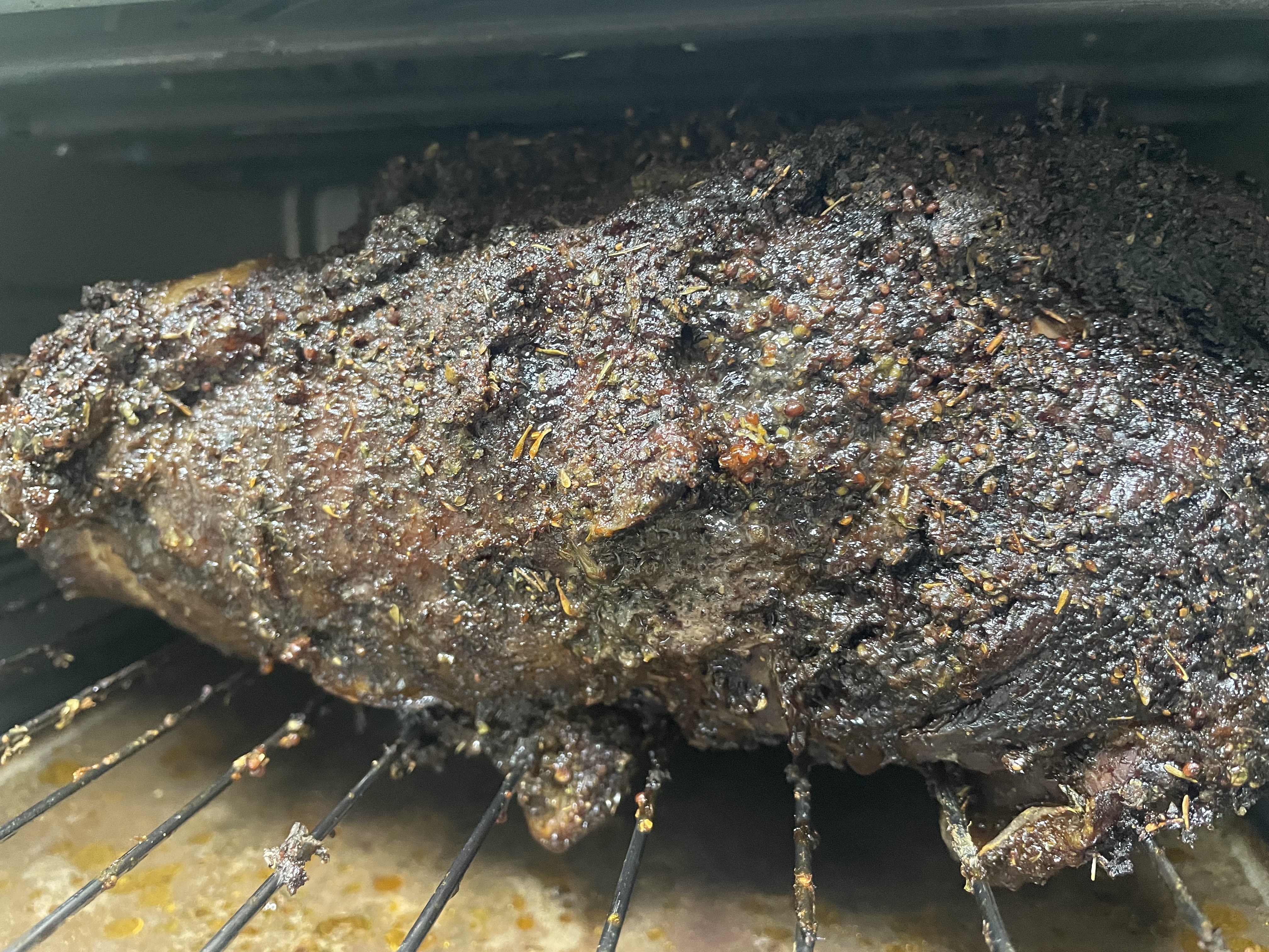 처음 4시간은 30분마다 와인, 생강청 등을 발라주며 굽다가, 중간에 종이 포일로 감싸서 구워주었습니다. 가로방향으로 수축하고 세로 방향으로 늘어나서 열판에 닿을까 걱정했습니다.