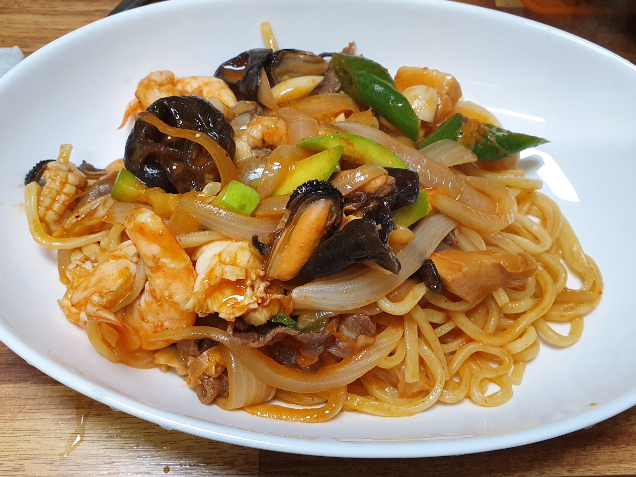 면 삶고, 양파, 양배추, 버섯 볶다가 고기 넣고 해물 넣고 고춧가루 풀고, 간장 좀 넣고,