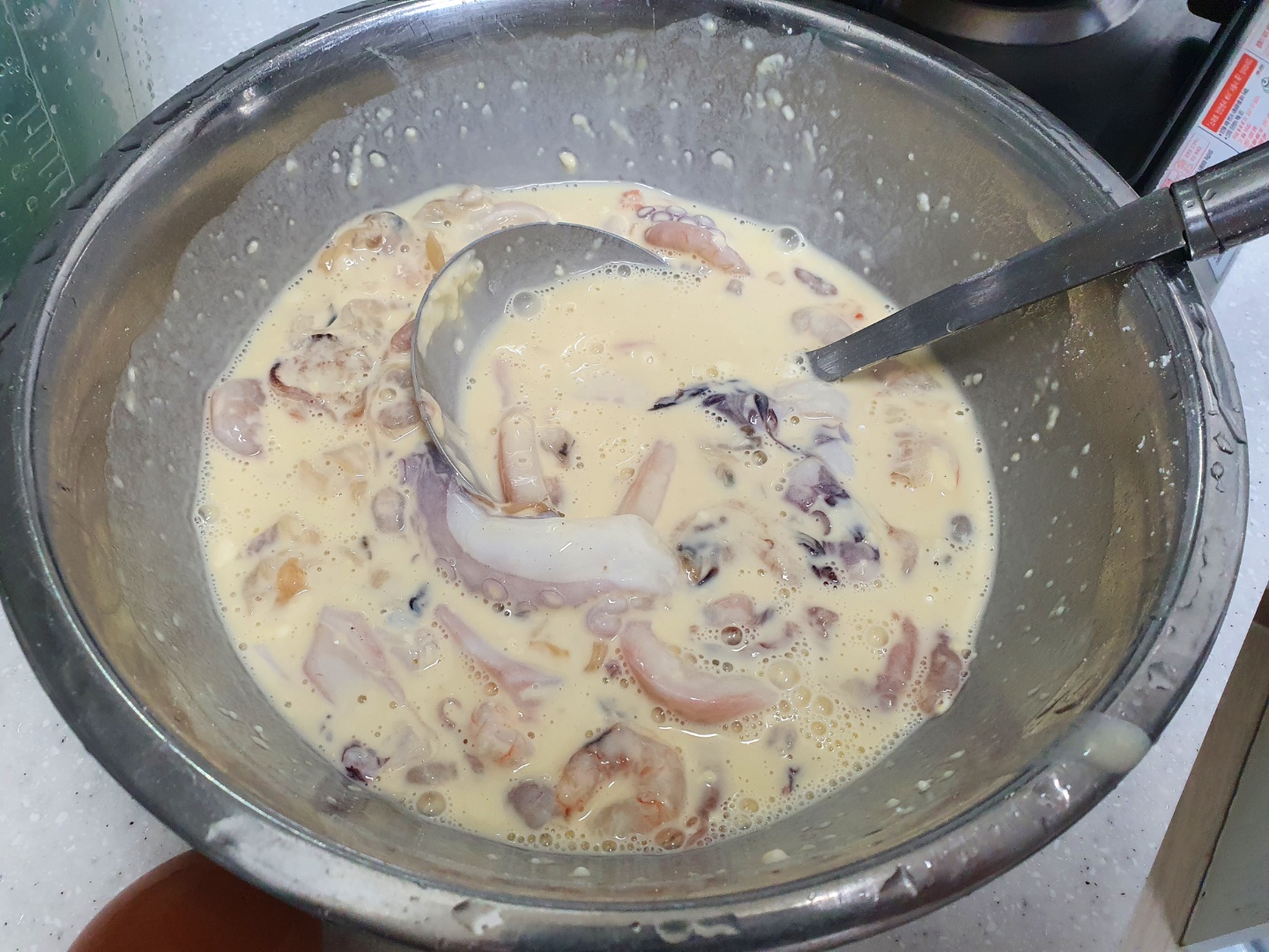 해물에 밀가루와 물을 넣고(밀가루의 경우는 소금 후추 등으로 간을 해야 합니다.) 섞어줍니다. 저는 묽은 것을 좋아해서 물을 많이 넣었습니다. 보통 부침가루 사면 가루와 물 적정 비율 적혀있으니까 그걸 따라가시면 됩니다.