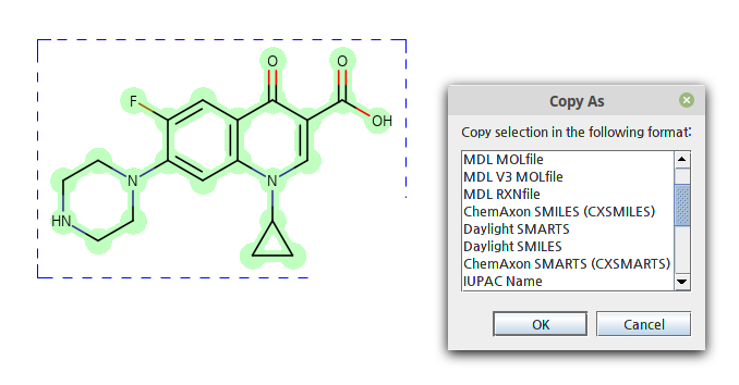 우클릭한 후 Copy As를 누르고 여기서 ChemAxon SMILES나 Daylight SMILES를 선택할 수 있습니다. |