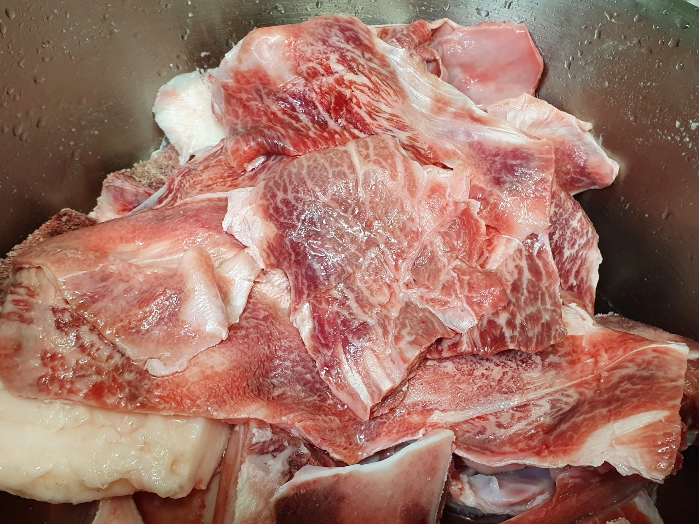 사는 김에 냉동 정육 코너에 스지라고 쓰여있는 것을 하나 가져왔습니다. 100g에 2900원이고 400g 정도 됩니다. 잡뼈와 스지를 물에 넣고 녹이면서 핏물을 빼줍니다. 그런데 이거 아무리 봐도 스지가 아니라 근막 같네요. 근막도 스지에 포함시키는 건가...?