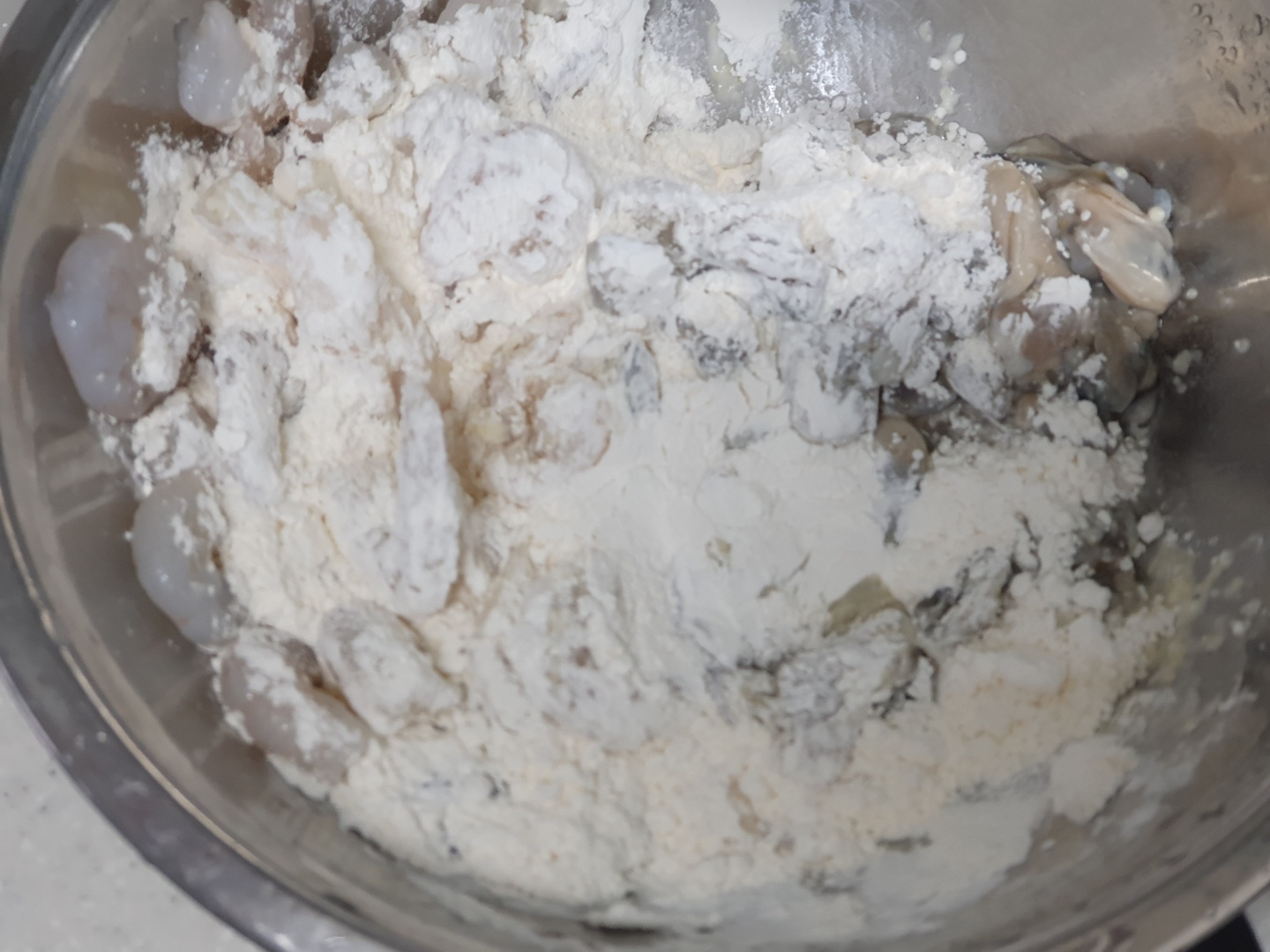 재료: 굴, 새우살, 오징어채, 부추, 밀가루, 피자치즈