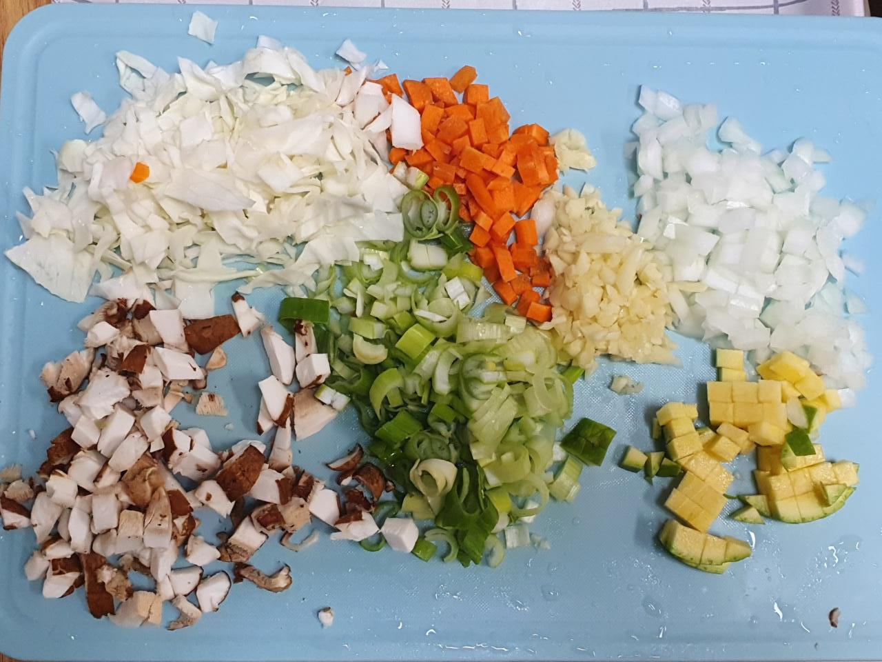 오징어 안에 넣을 재료를 다져줍니다. 양파, 파, 마늘, 당근, 양배추, 애호박, 버섯입니다. 오징어 다리도 썰어서 넣었습니다.