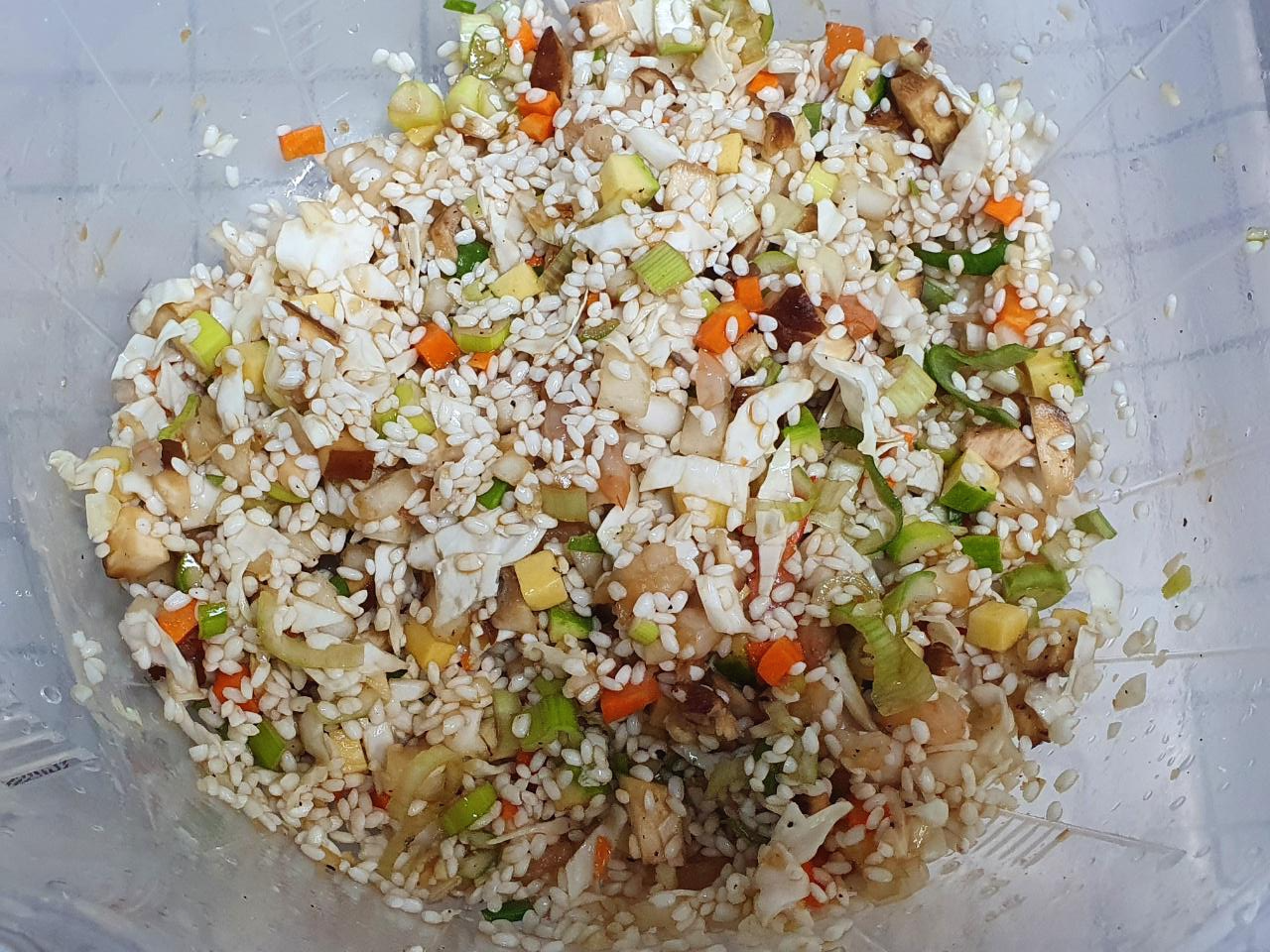 불린 후 물을 제거한 찹쌀과 섞어줍니다. 소금(혹은 간장), 후추로 간을 합니다.