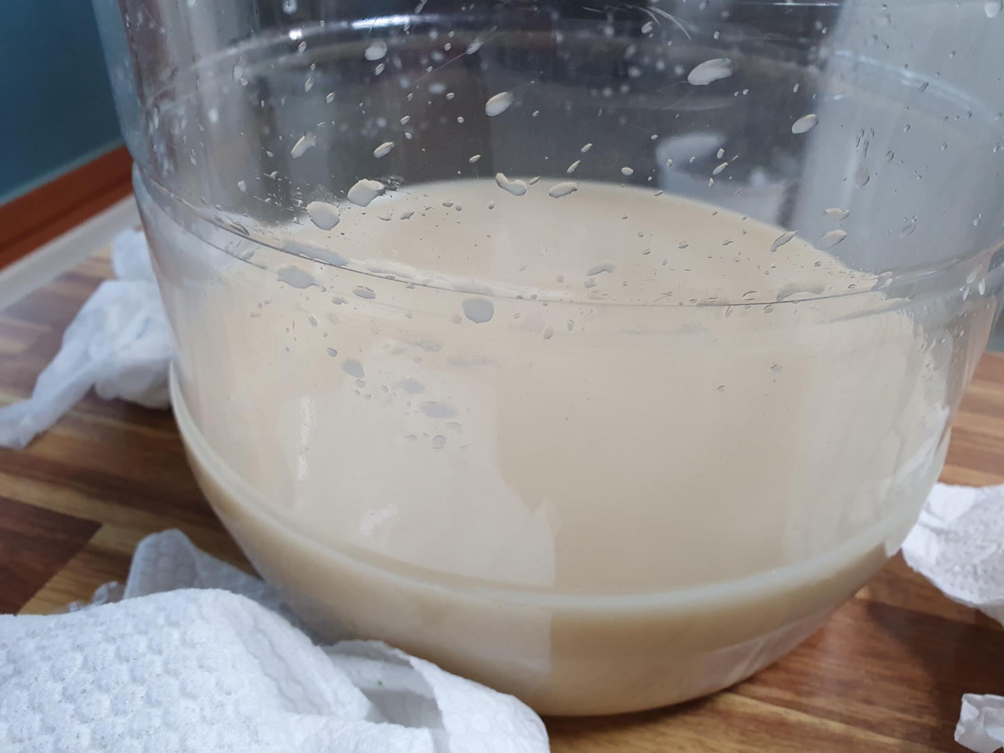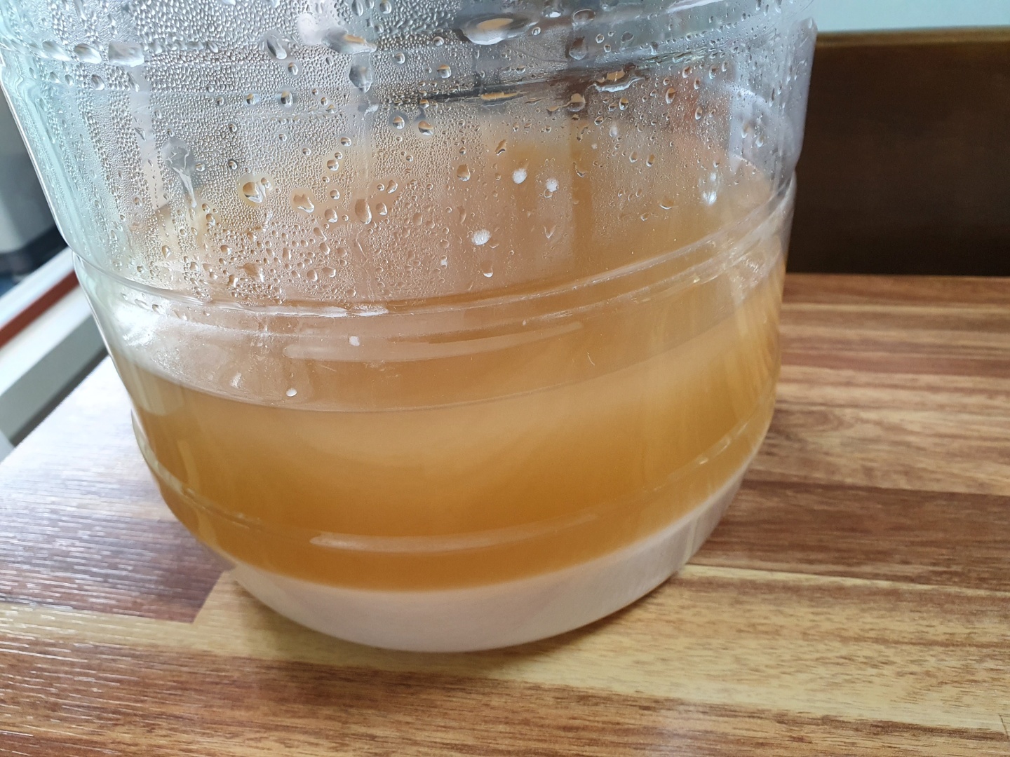 서늘한 곳에 며칠간 보관하면 찌꺼기가 가라앉으면서 맑아집니다. 아직 투명하진 않은데, 며칠 더 두면 투명해집니다.