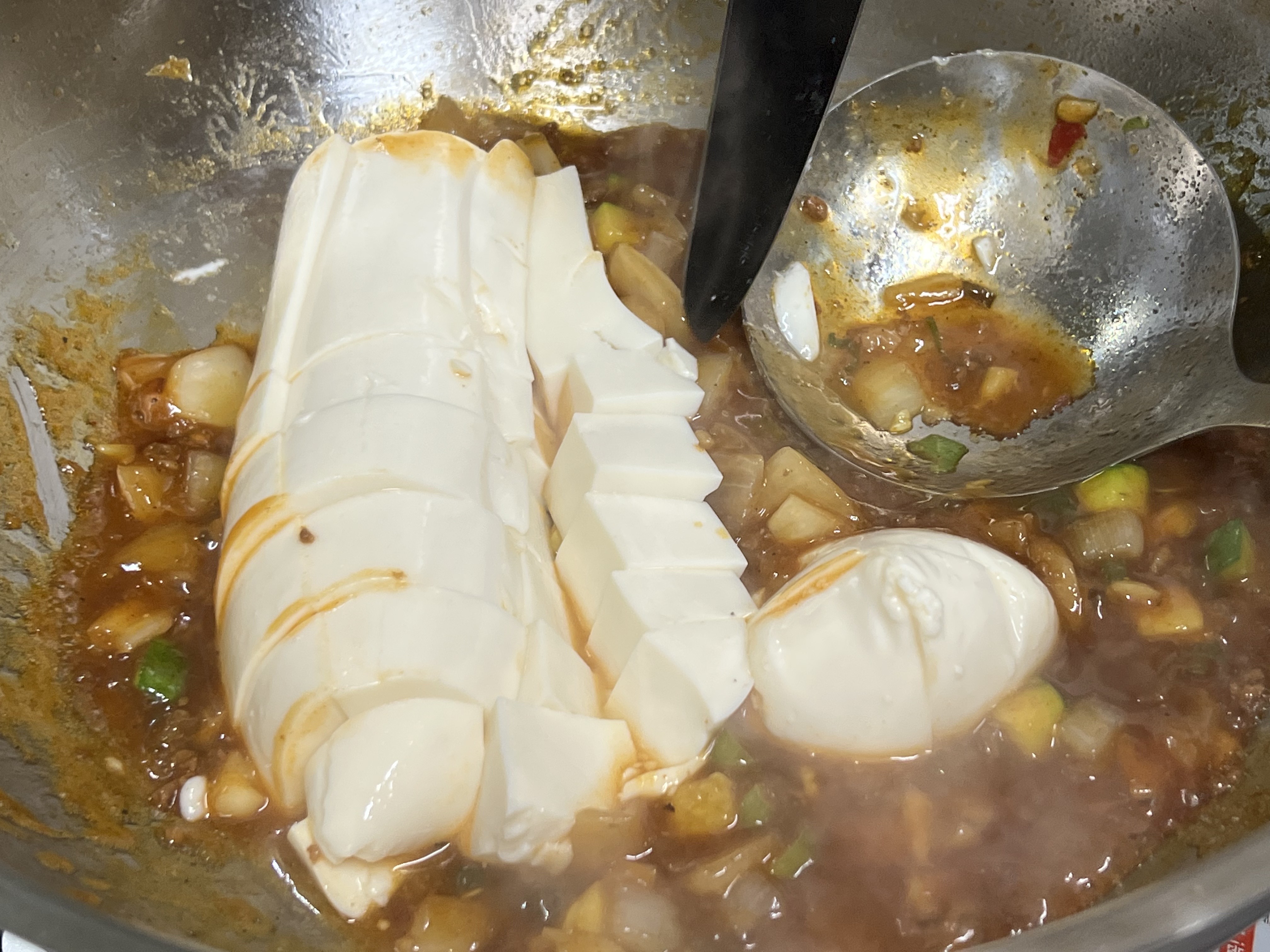가끔은 다진고기부터 사다가 볶다가 양념도 직접 만들어서 넣지만, 이번엔 그냥 양파와 마늘과 애호박만 볶다가 시판 양념을 넣었습니다. 산초가 좋아서 산초가루를 더 넣었습니다. 순두부는 도마에서 자르긴 좀 어렵고, 양념에 넣어준 후에 팬에서 칼로 잘라주면 됩니다. 좀더 반듯한 모양이 좋다면, 플라스틱에 들어있는 연두부를 쓸 수도 있습니다. 어짜피 봉지에 든 매끈한 순두부는 순두부라기보단 연두부에 가깝습니다. 순두부는 이렇게 매끈한것은 아니고, 시장에서 파는 두부 만드는 과정에서 물기 안빼고 바로 응고시킨 뭉글뭉글한 것이죠.